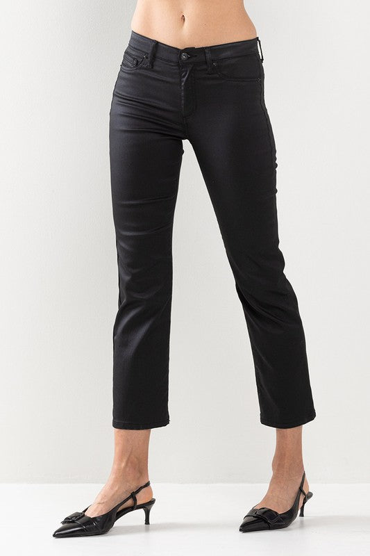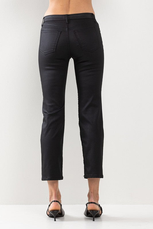 MID RISE SLIM STRAIGHT COATED JEANS IN BLACK Leg Opening: 14 1/2" Front Rise: 9 5/8" Inseam: 28" Knee: 15 1/4"