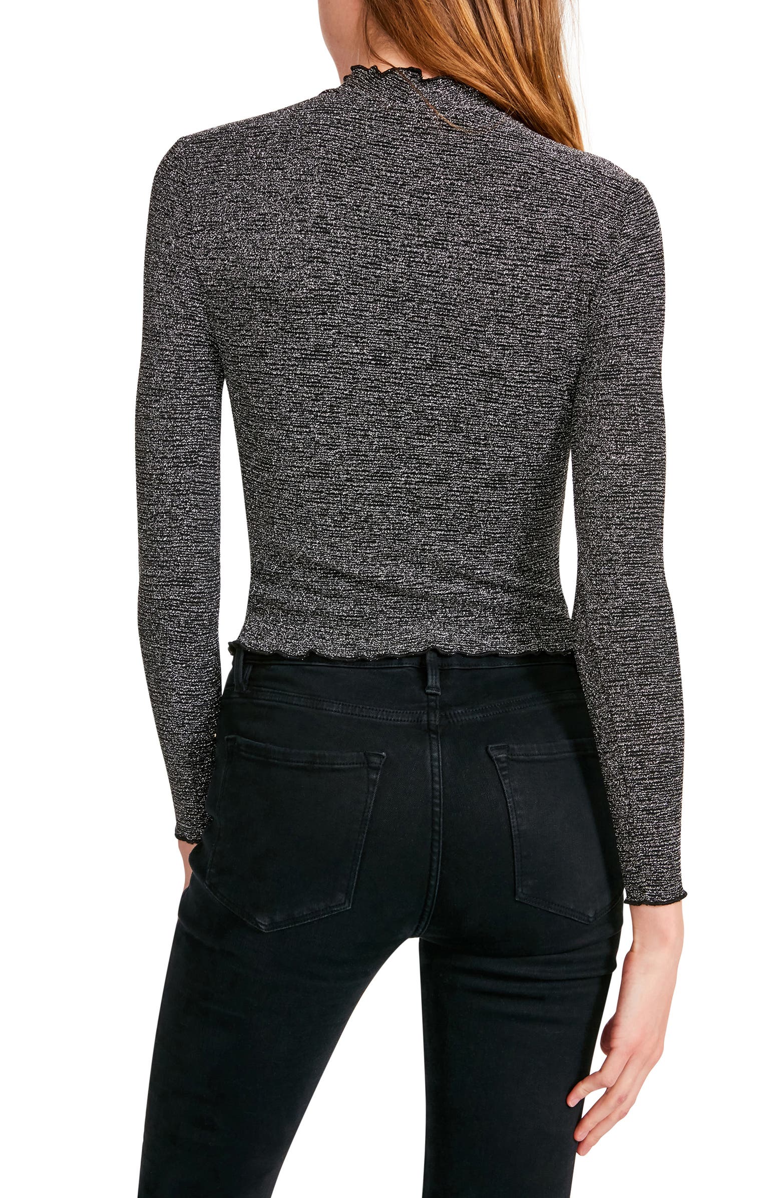 Elevate your look with this sleek long-sleeve blouse featuring allover shimmer.