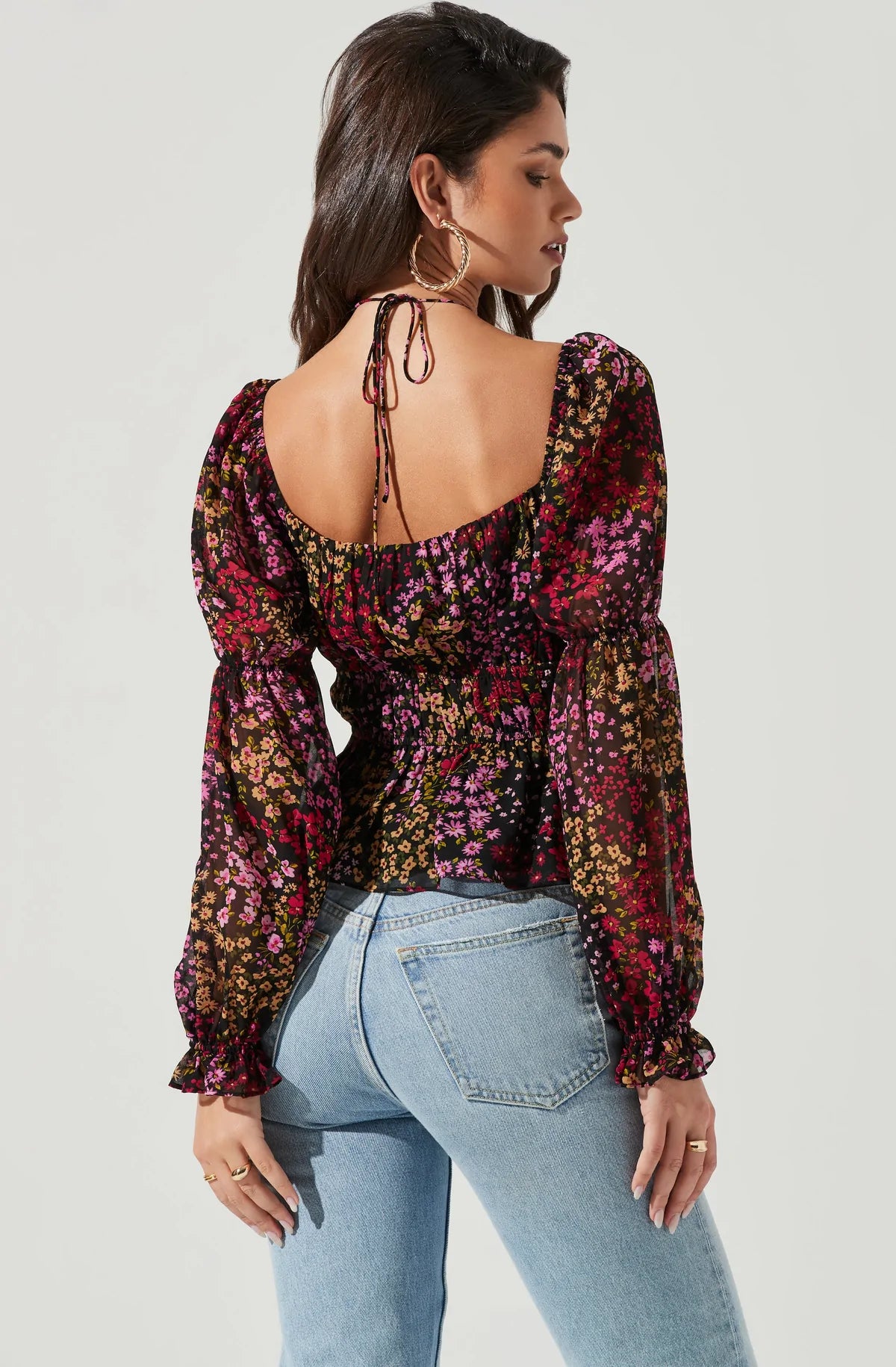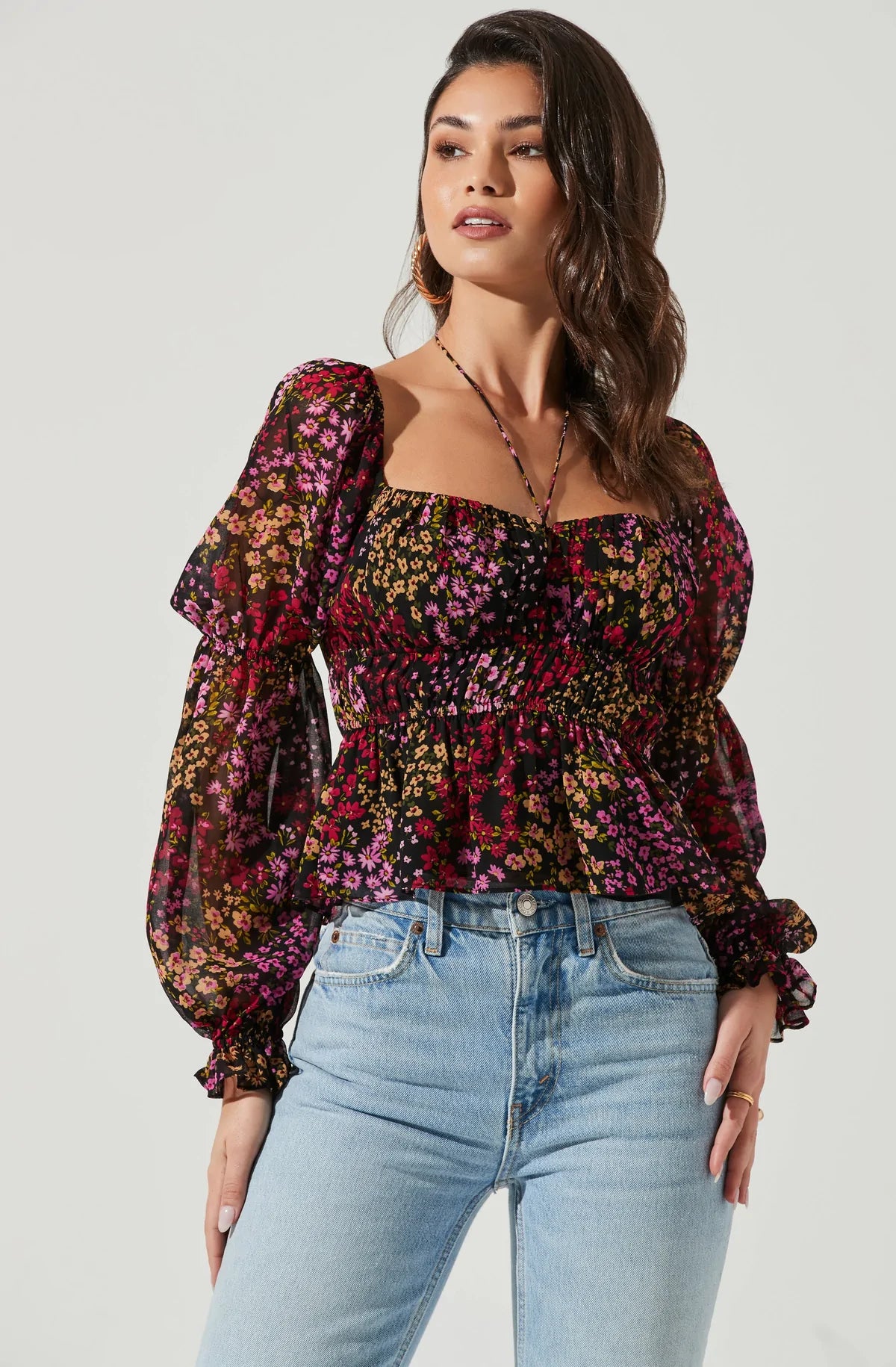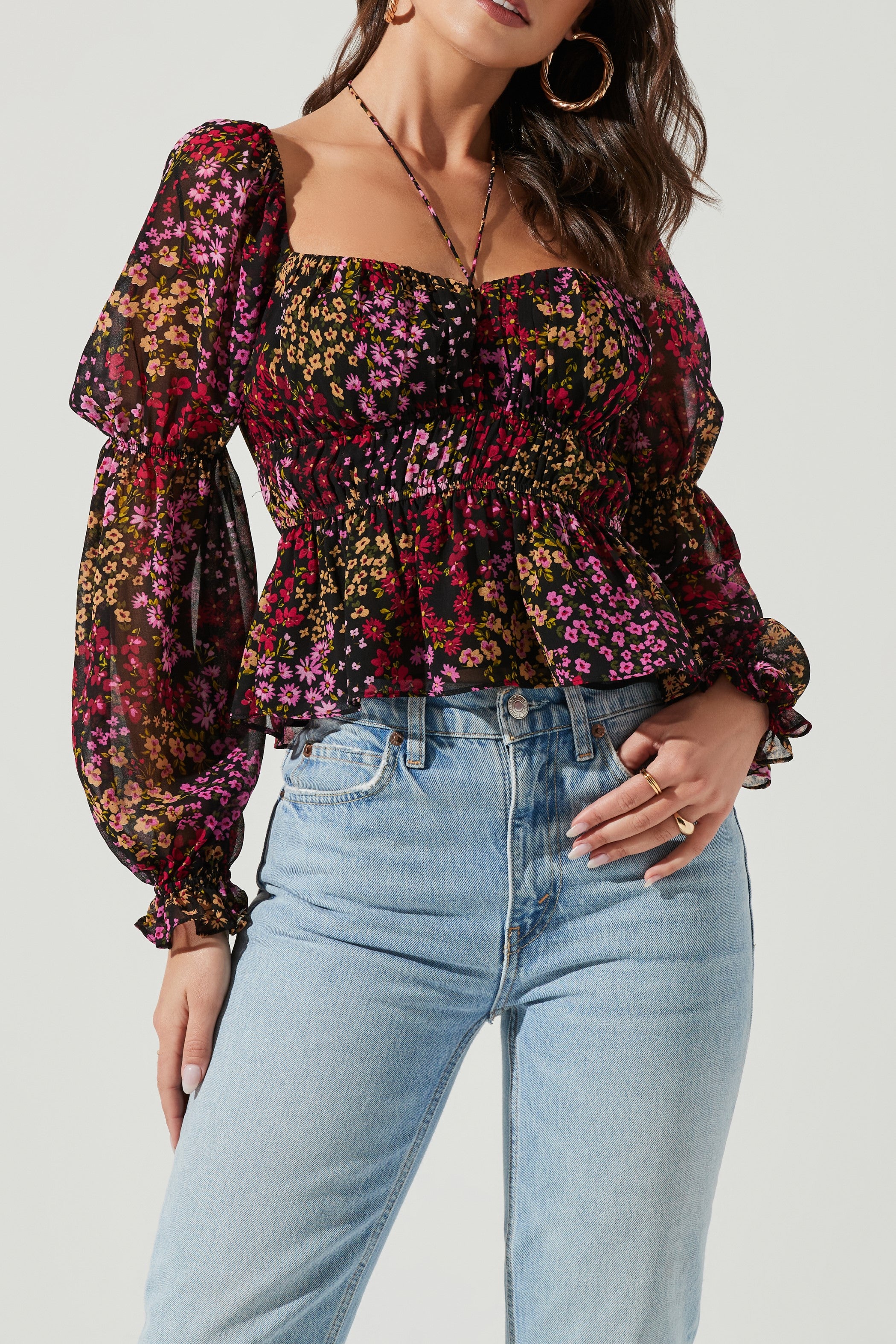 The Bloomfield Top features a halter tie accent that leads to a sweetheart neckline and smocked waist. Peplum hem. Long sleeves with smocking at the elbows and cuffs.
