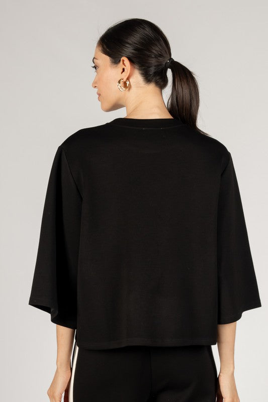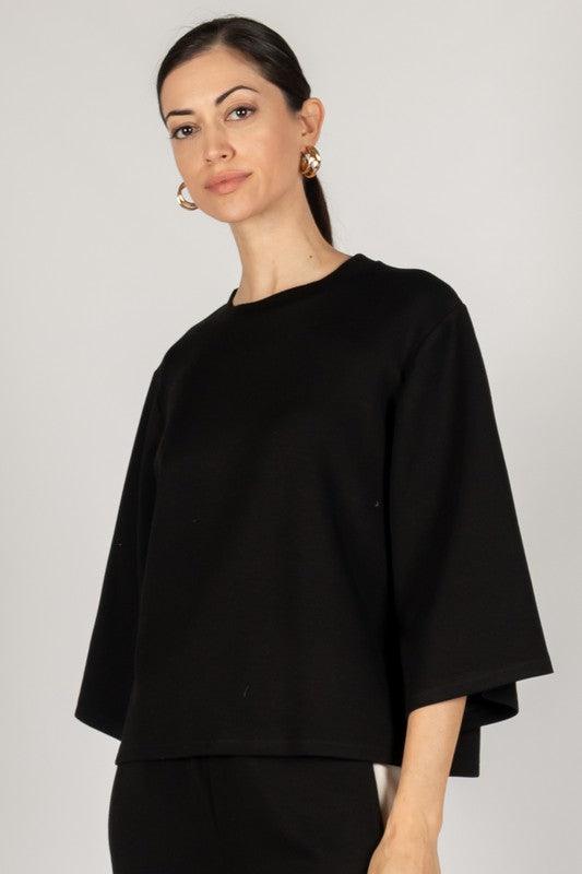 - Scuba modal fabrication - Loose fit - Wide sleeves - 3/4 length - Round neckline - Dropped shoulder