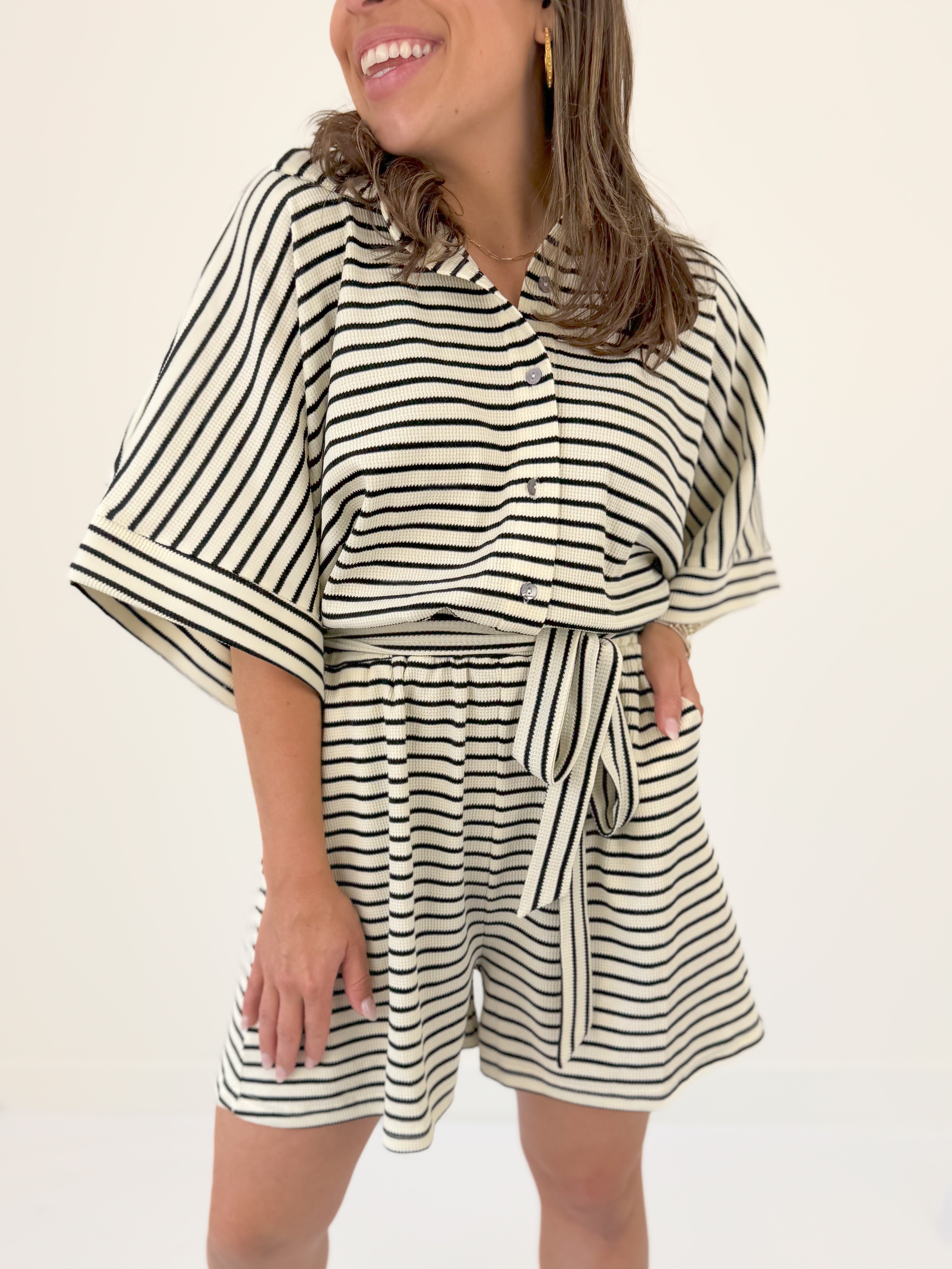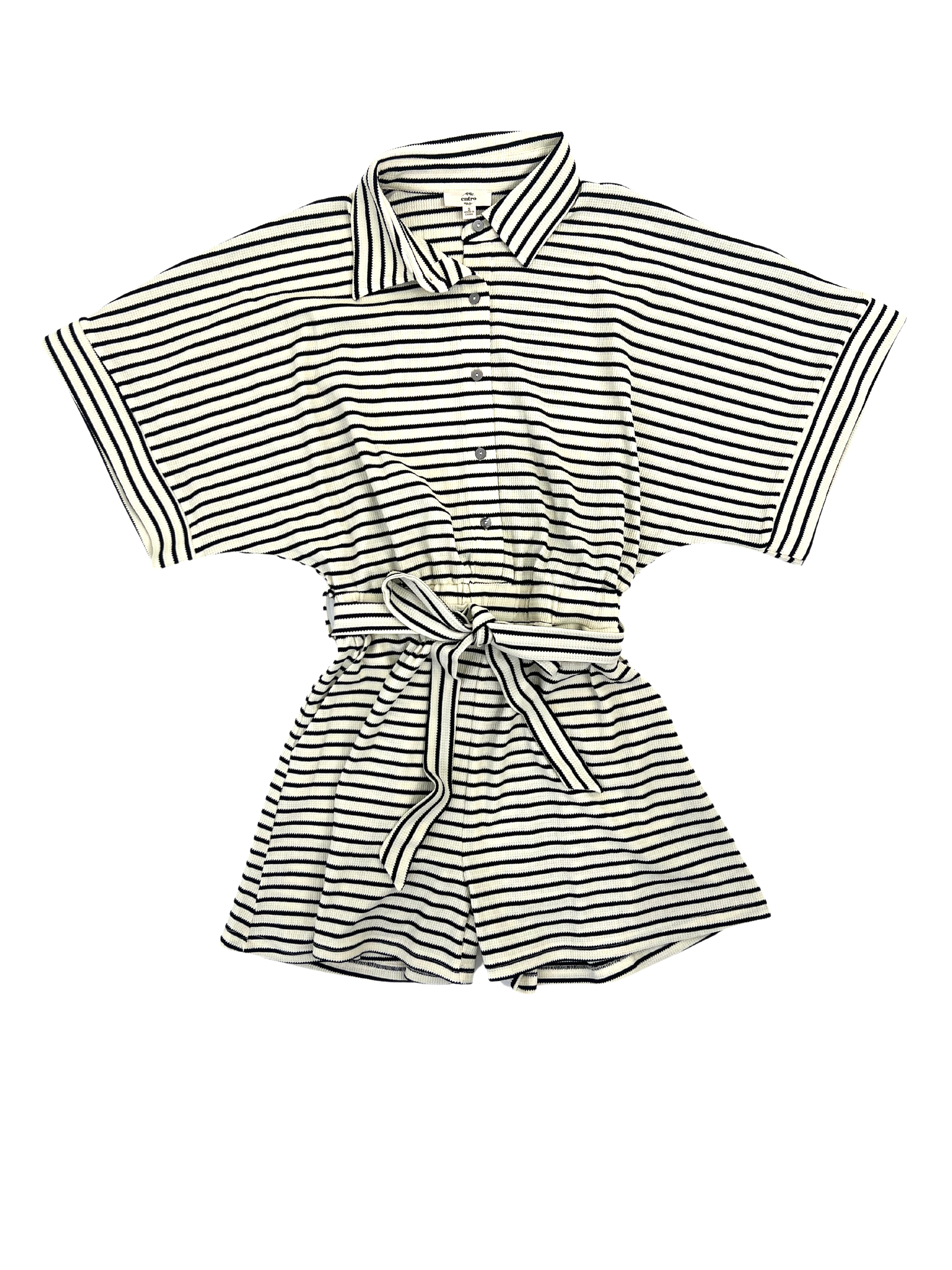 Textured stripe print button down collared half sleeve romper featuring self tie at waist. Elastic at waist. Belt loops. Pocket at sides. Unlined. Knit. Non-sheer. Lightweight.