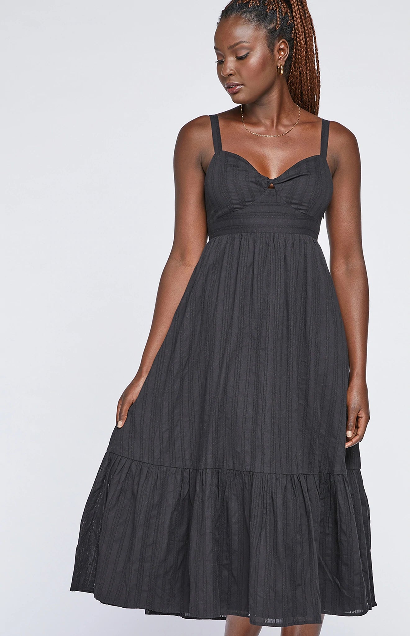 The Shae dress is made of a textured cotton stripe fabric and is fully lined. Features include adjustable straps, front twist detail, and back smocking panel for ease of wear.