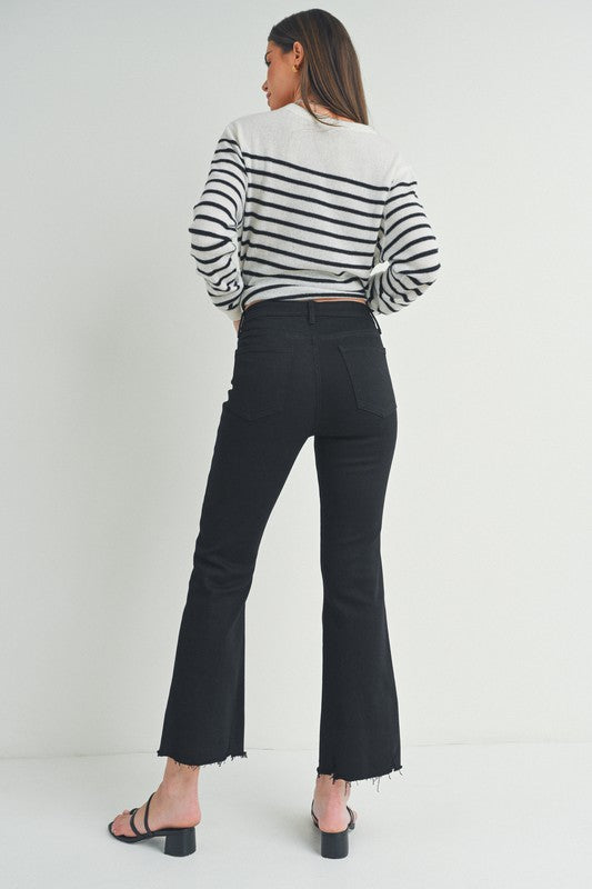 HIGH RISE CROPPED FLARE WITH DISTRESSED HEM IN BLACK DENIM