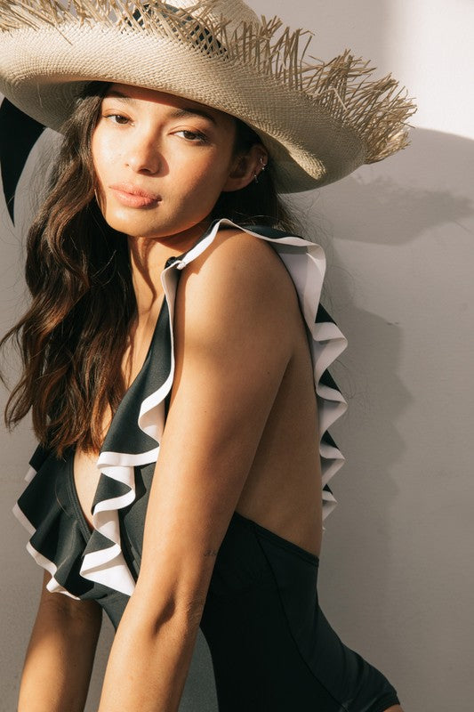 Black/White Trim Vneck Ruffle One Piece Swimsuit