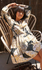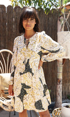 Flowy long sleeve dress featuring an all-around patchwork print, elasticated cuffs, self-tie, and tiered skirt.
