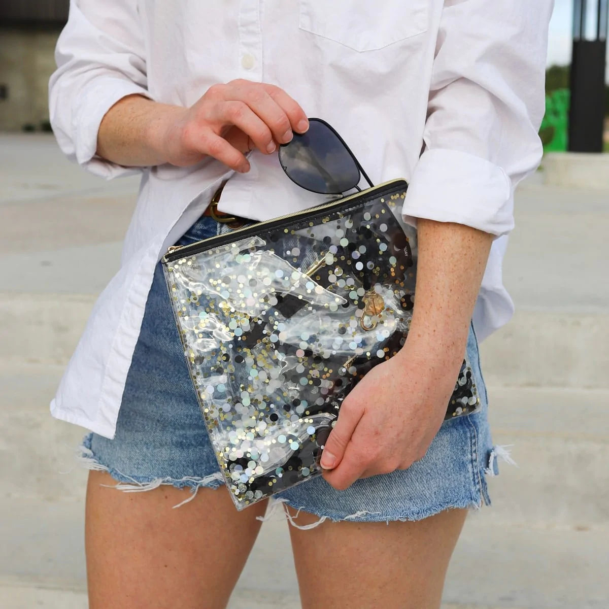 Carry a little school spirit with you wherever you go thanks to this clear pouch packed with confetti we designed! Perfect for gamedays, tailgating, and everydays too is this must-have bag that's ready to hold anything and everything like its name. Did we mention the variety of black confetti inside this pouch has you covered if you're cheering for any team? From the Raiders to Mizzou and every team in between this bad boy brings the fun.
