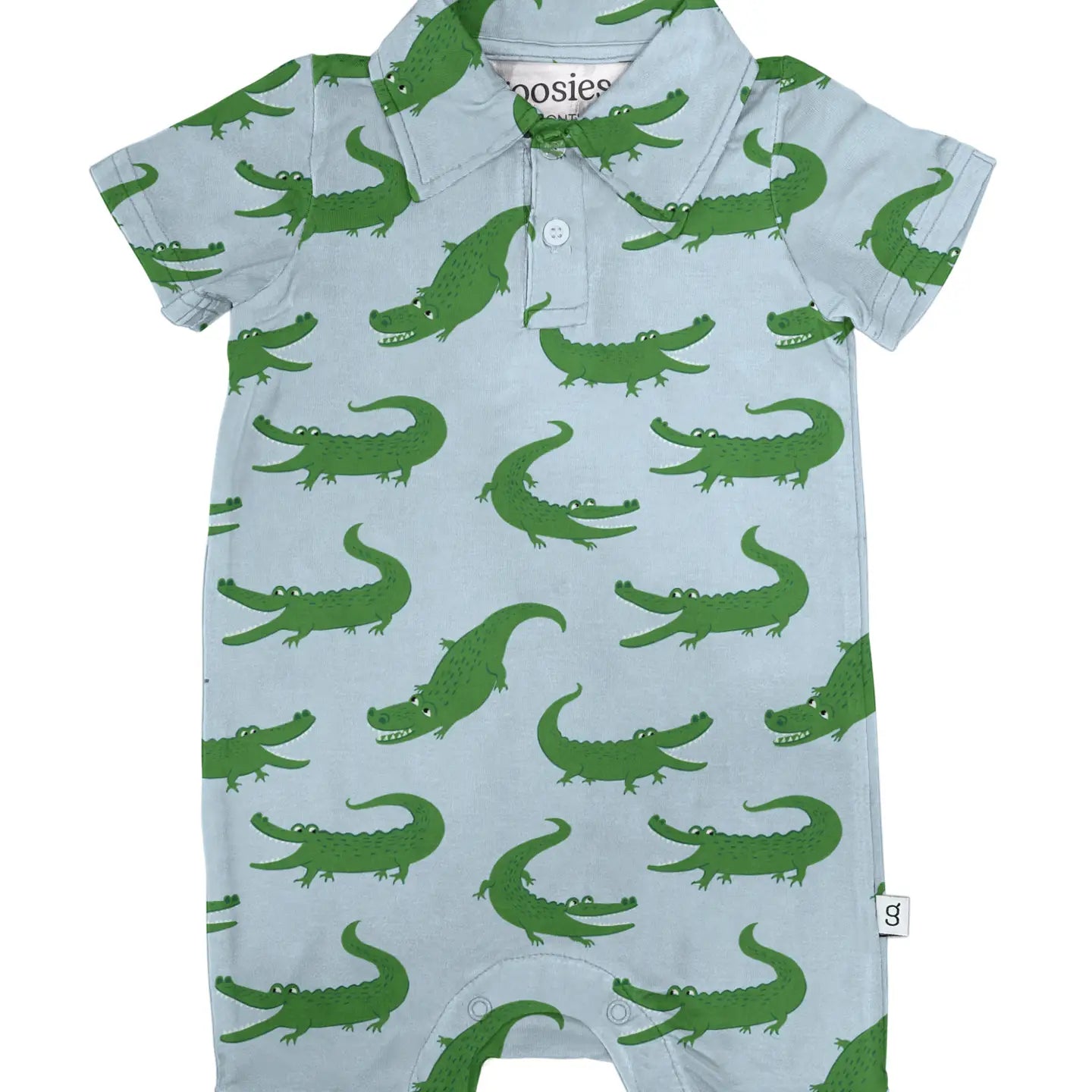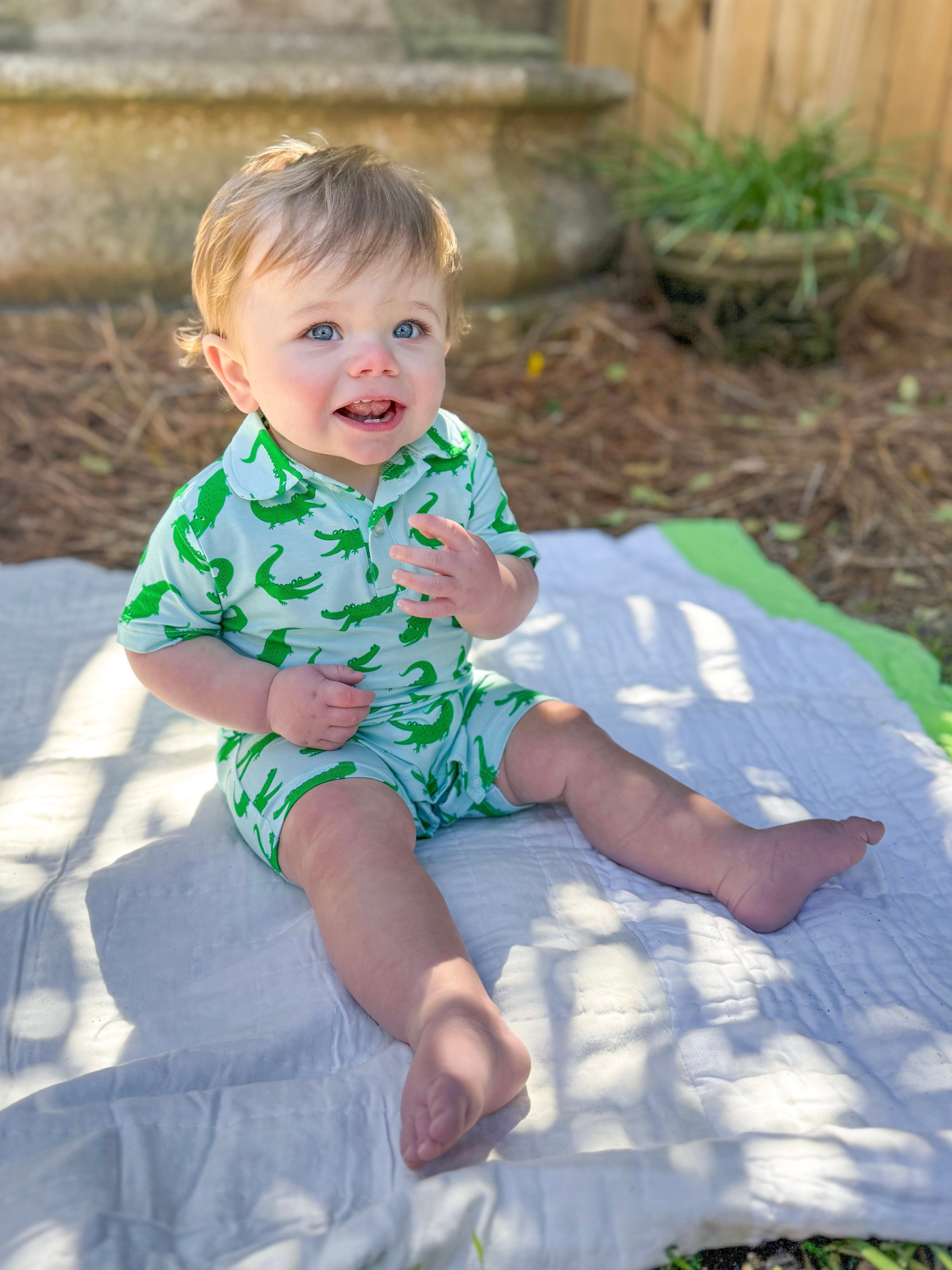 Our short Sleeve Polo Romper features a soft collar, button placket and snaps at the legs. 95% bamboo, 5% spandex. Tagless. Machine wash on gentle cycle with like colors. Tumble dry on low, if necessary.