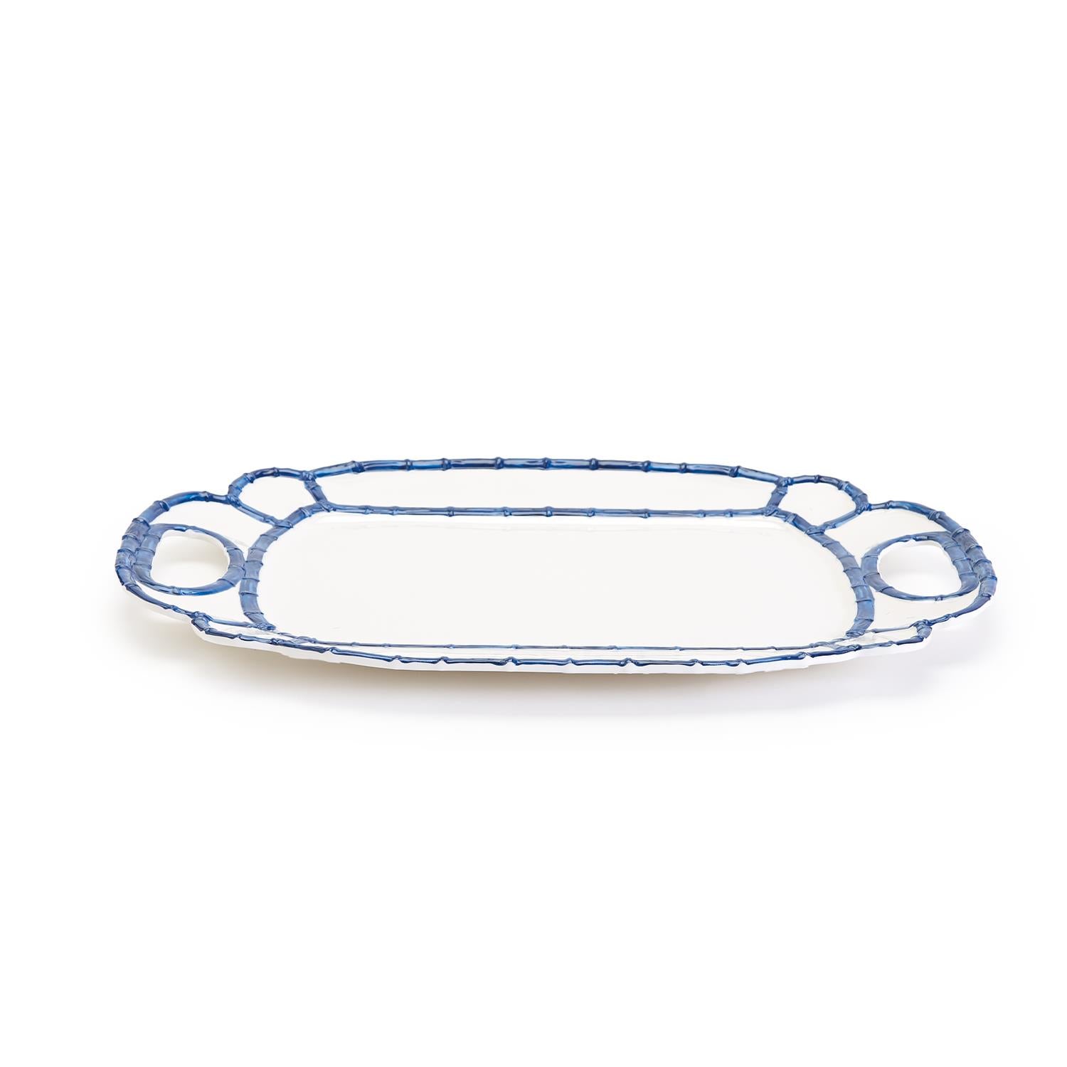 A sculptural bamboo blue rim lends an elevated look to this product. Functional design with handles that can easily transport for serving dinner, lunch or catering to parties, picnics, and BBQ's.