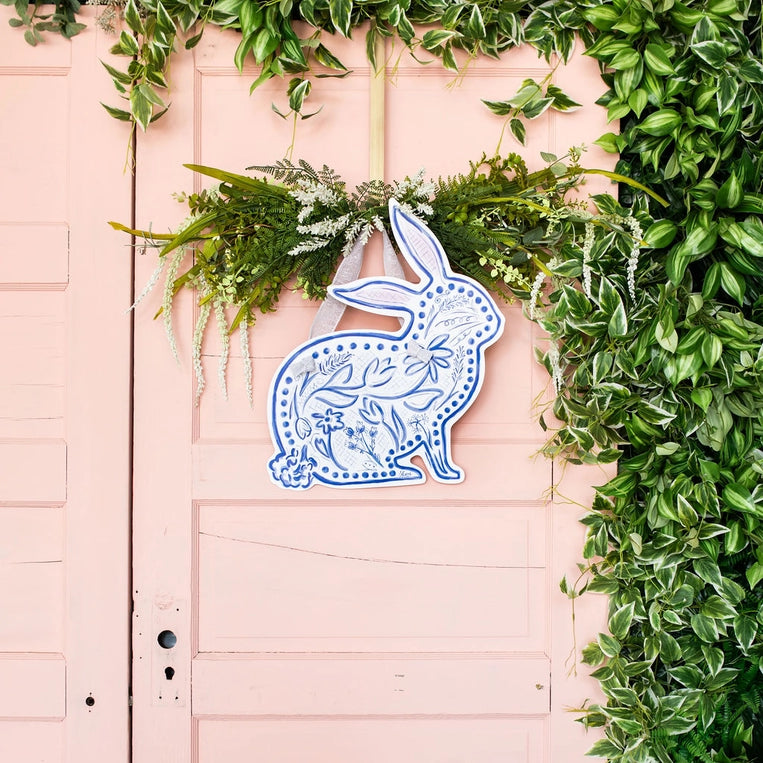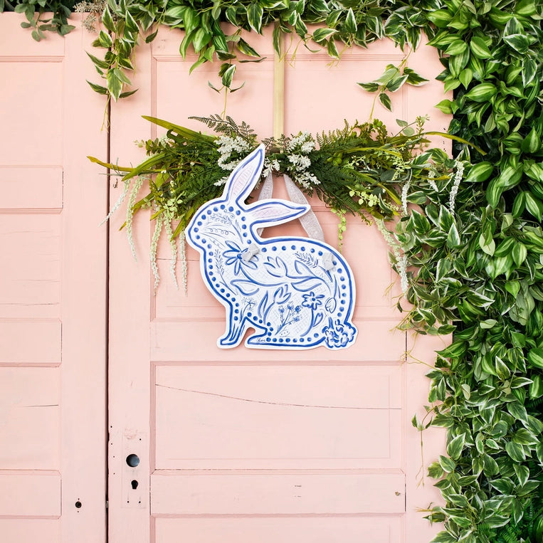 This fun twist on the traditional Chinoiserie bunny is the perfect addition to Spring and Easter decor! This design comes with a left-facing bunny or a right-facing bunny, perfect for double doors! The door hanger measures approximately 16" x 19". You can also choose a thickness of the product the design is printed on; both are just as durable! The product image shows the 1/4" inch material with the right-facing bunny. Ribbon style and length may slightly differ from the photo, depending on inventory of ribbon.