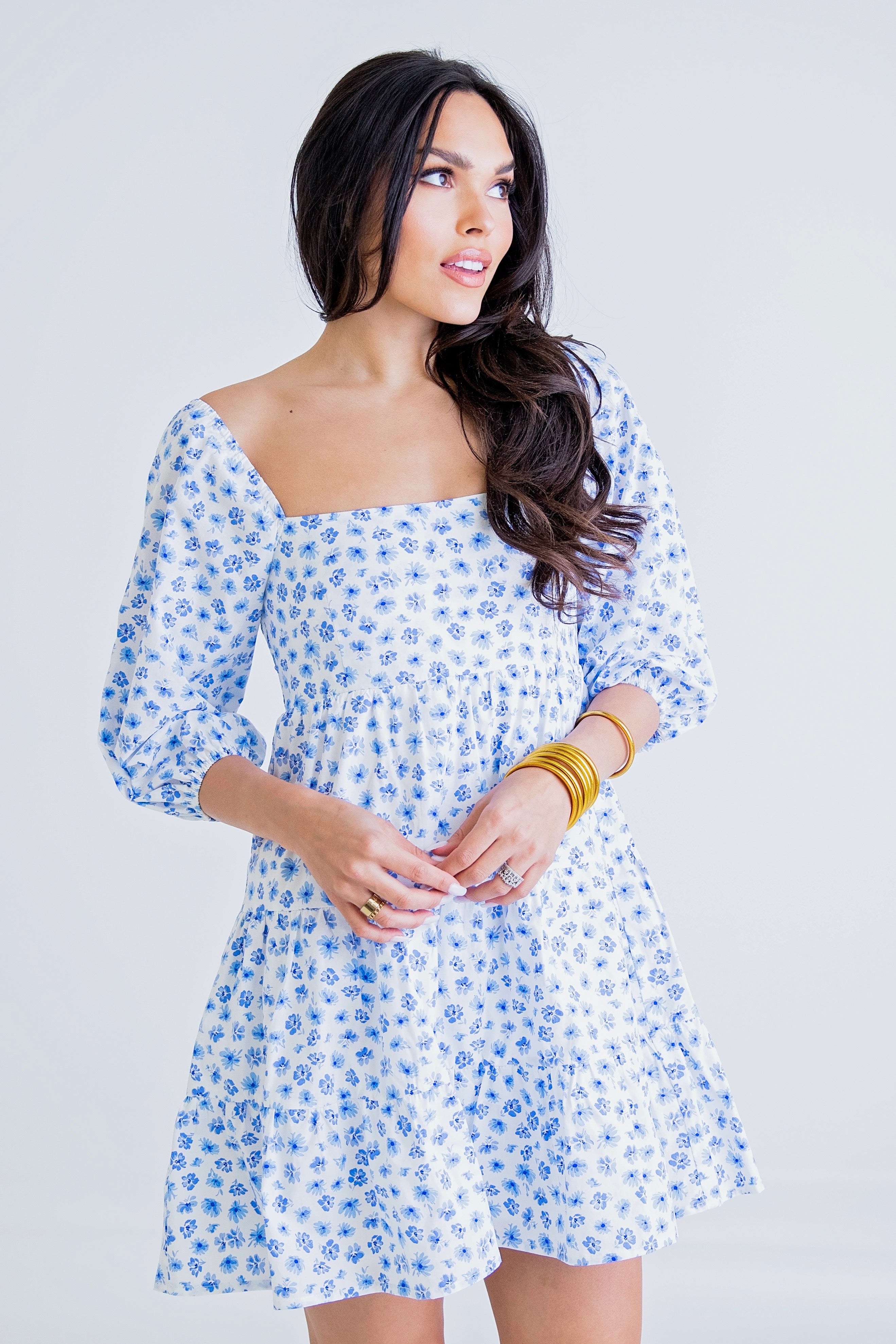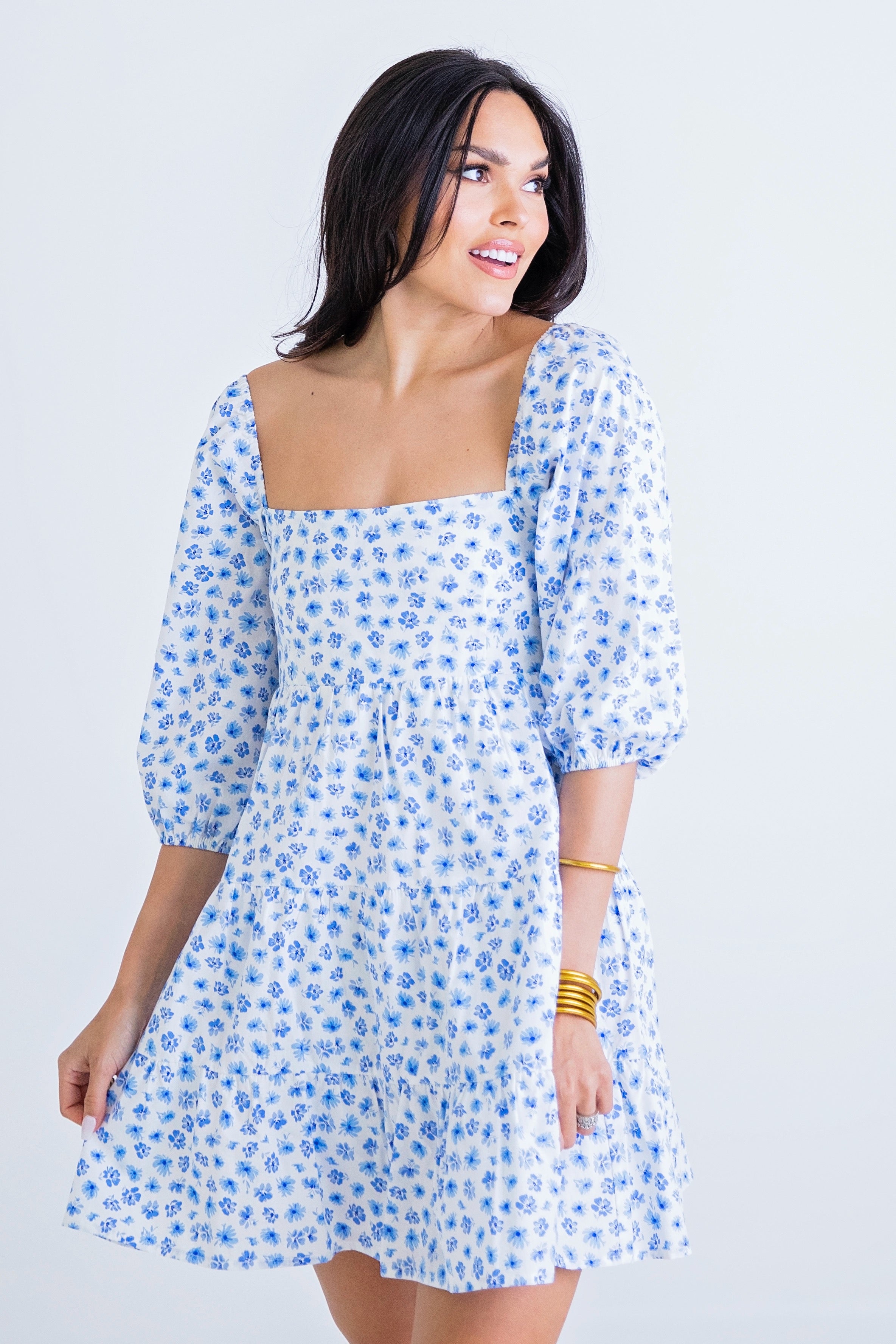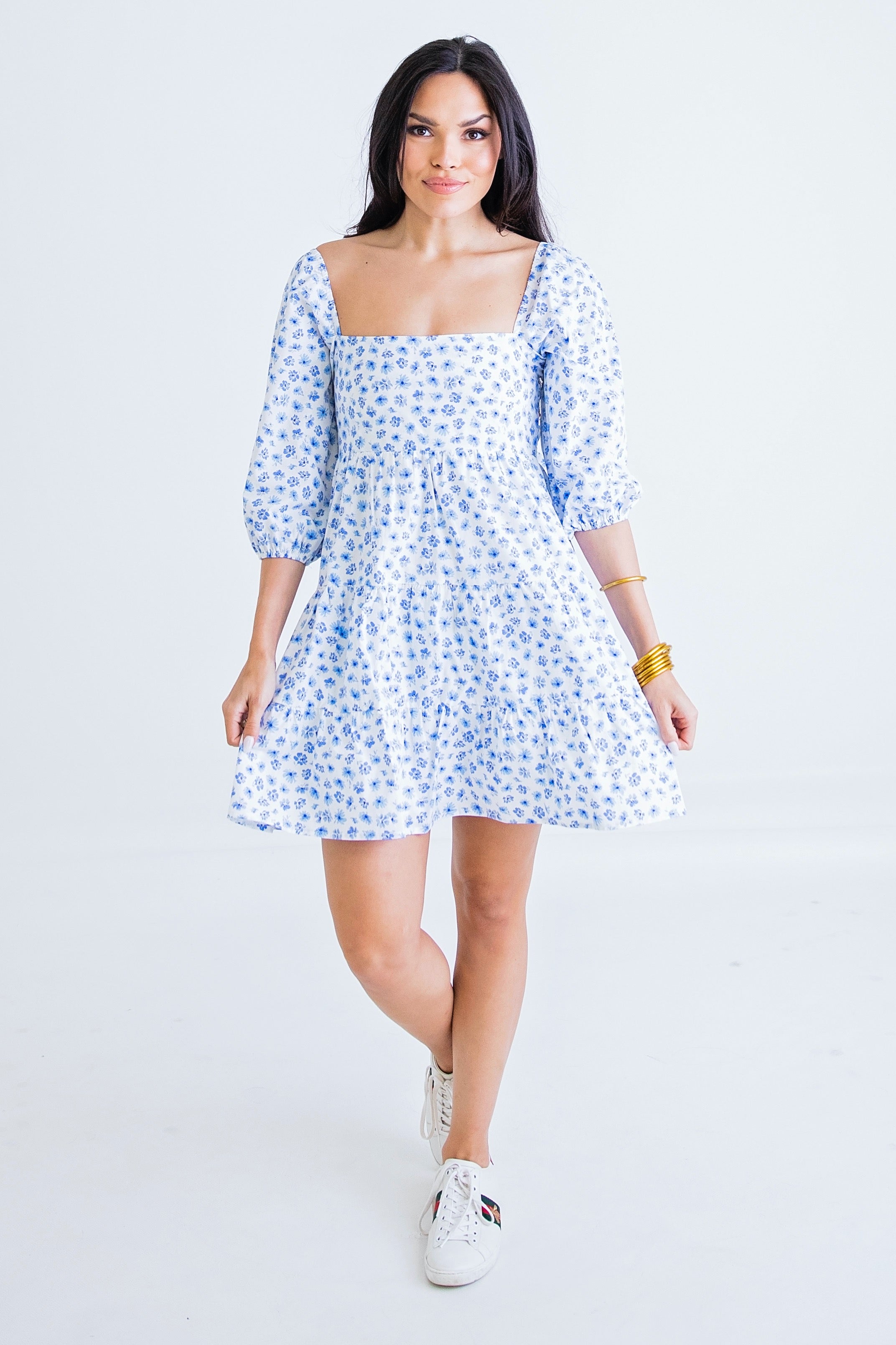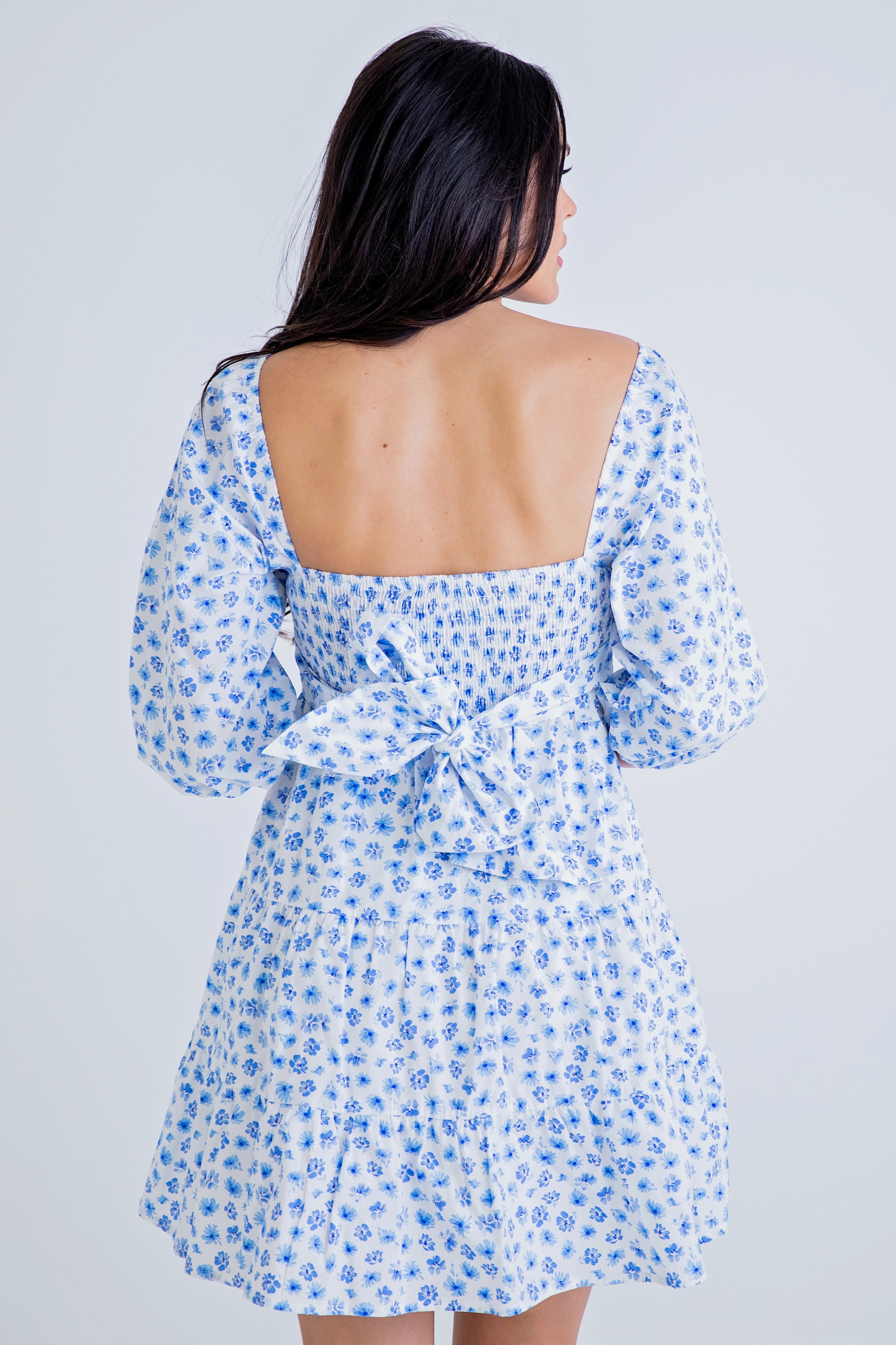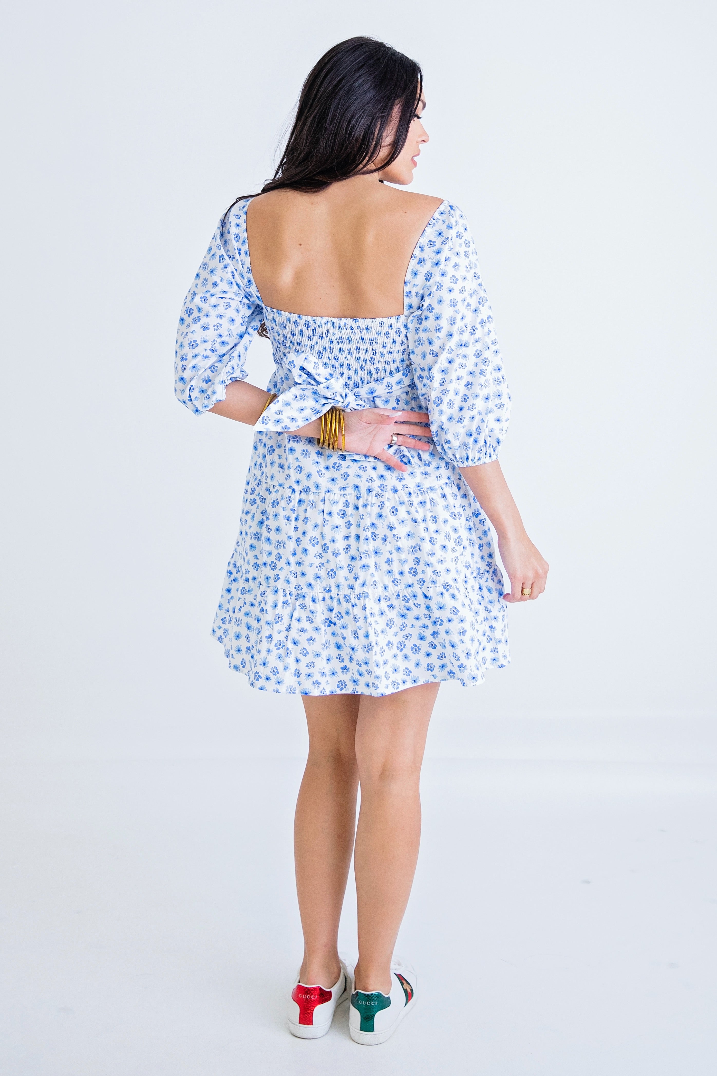 Blue/White Floral Poplin Back Tie Smocked Dress