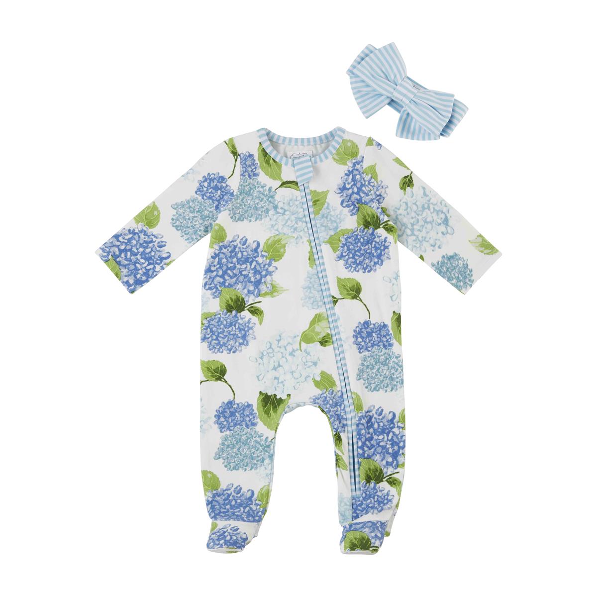 Dress your little darling in this Blue Hydrangea Baby Sleeper Set. The two piece set comes with a cotton spandex footed sleeper. The sleeper features a white background with images of blue hydrangeas throughout. The sleeper also comes with a coordinating jersey bow headband.