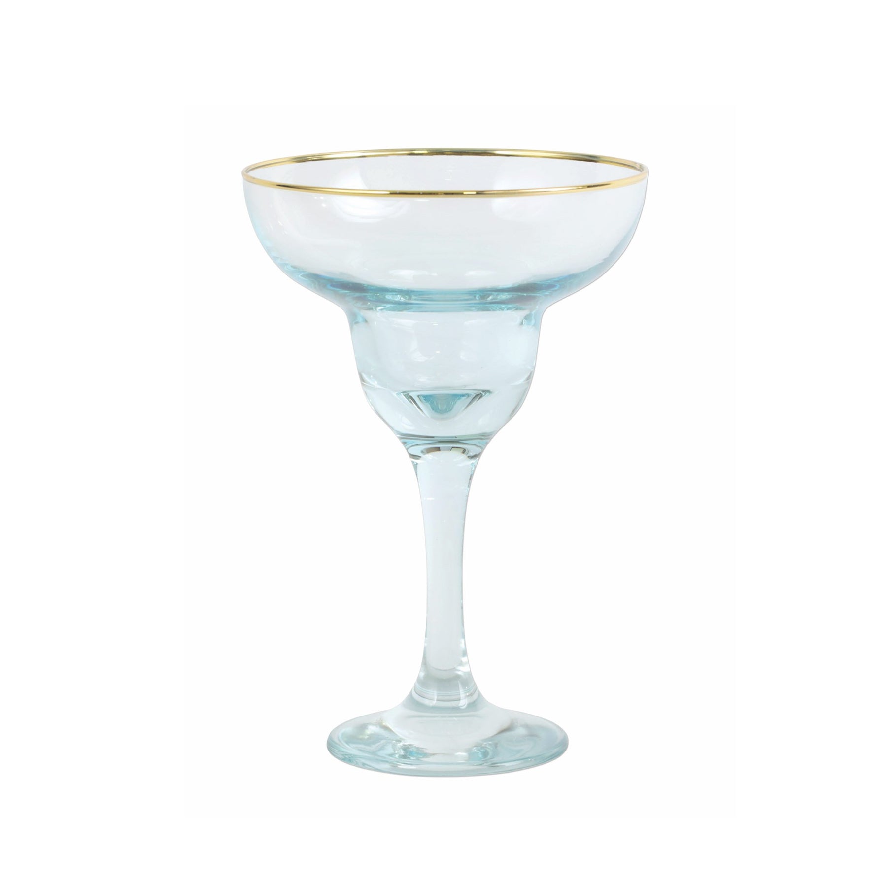 Add sparkle to any setting with a gilded gold rim and varied colored glass that refracts light on the Rainbow Margarita Glass.