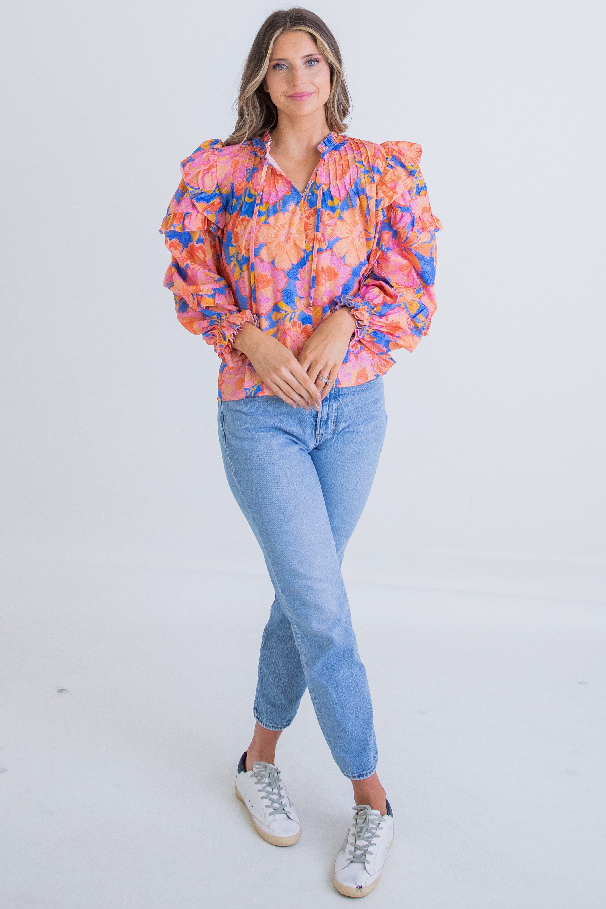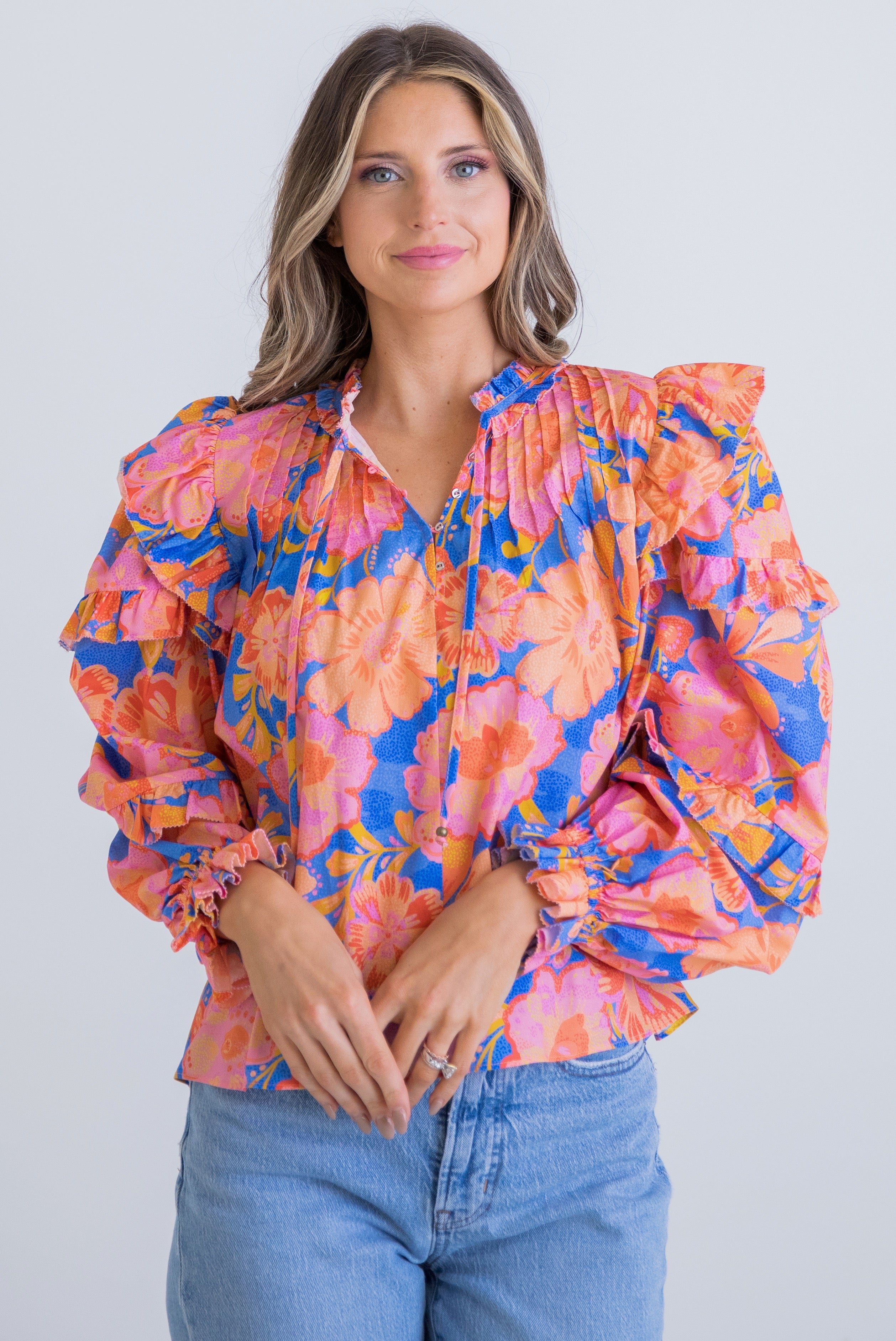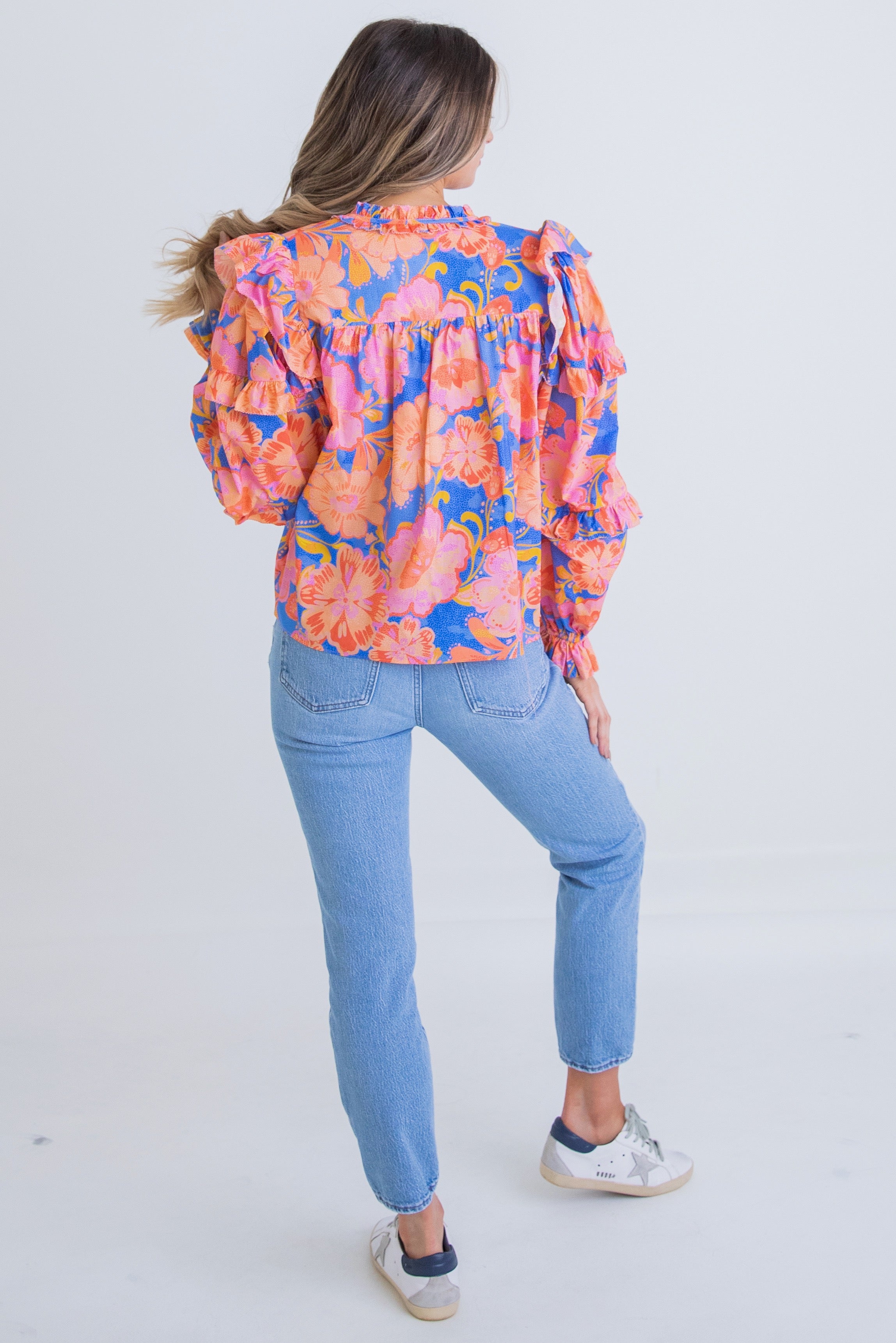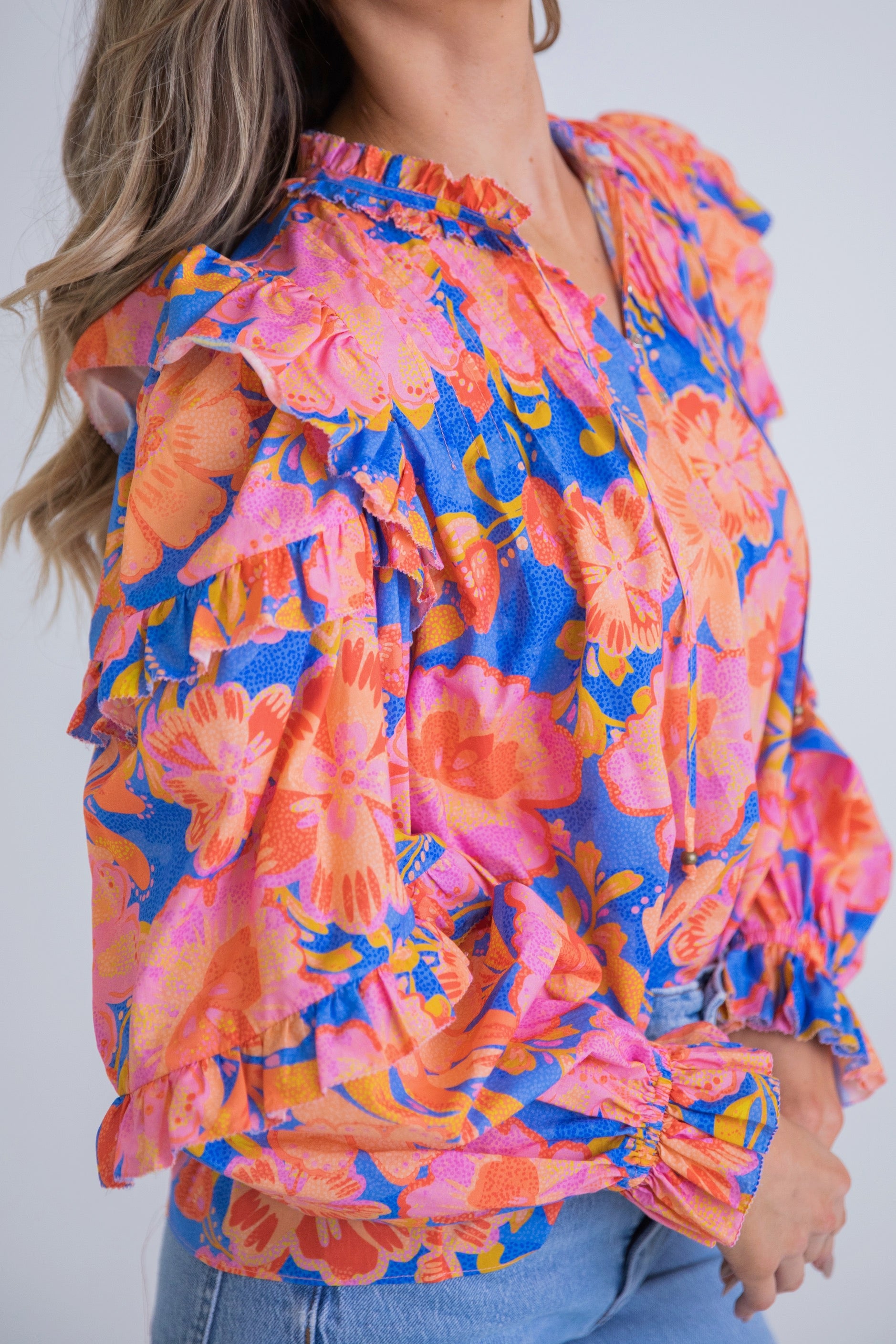 Blue/Orange Floral L/S Ruffle Top