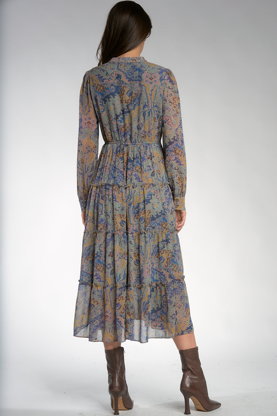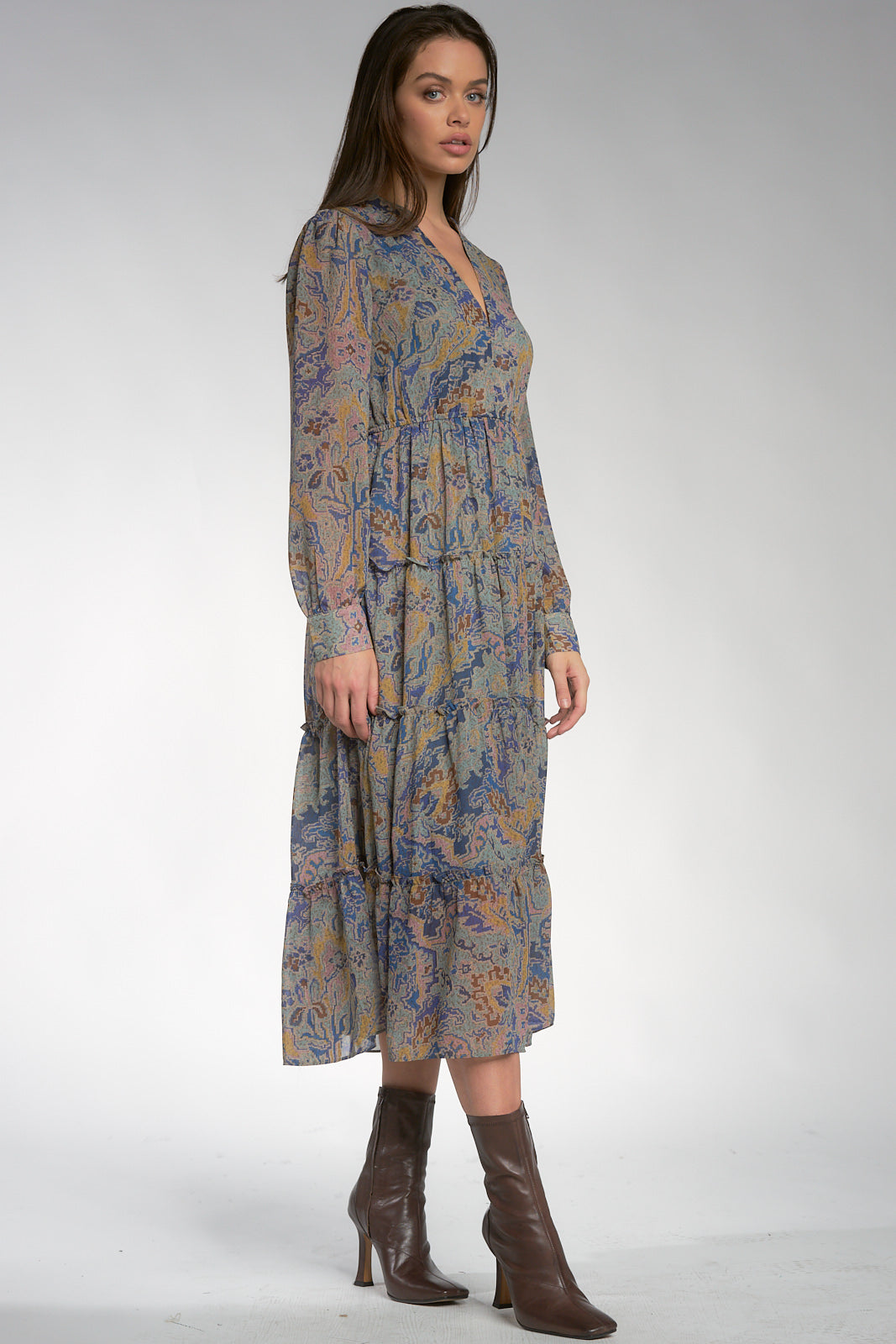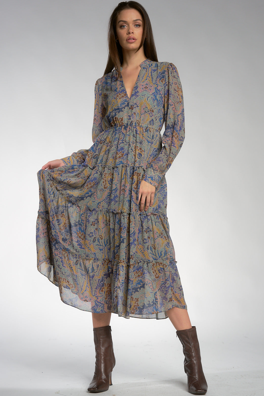 Beautifully designed in ruffle tiers and a charming low v-neckline, style with classy boots and fall accessories for a look to turn heads.