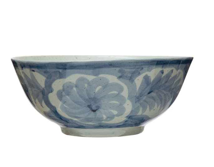 14" Round x 5-3/4"H Hand-Painted Stoneware Bowl w/ Design, Blue & White