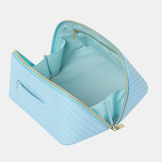 Introducing our stunning Herringbone Beauty Bag Medium in a soft Pistachio hue. This woven-look outer beauty bag features a luxurious double gold zip that effortlessly glides open, revealing a spacious, wide and flat internal compartment, allowing for easy visibility of everything at a glance. With ample room to store your beauty essentials, this bag also boasts an internal zipped pocket, keeping your smaller pieces secure and easily accessible.