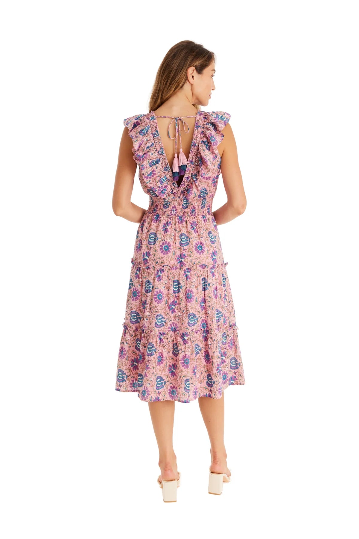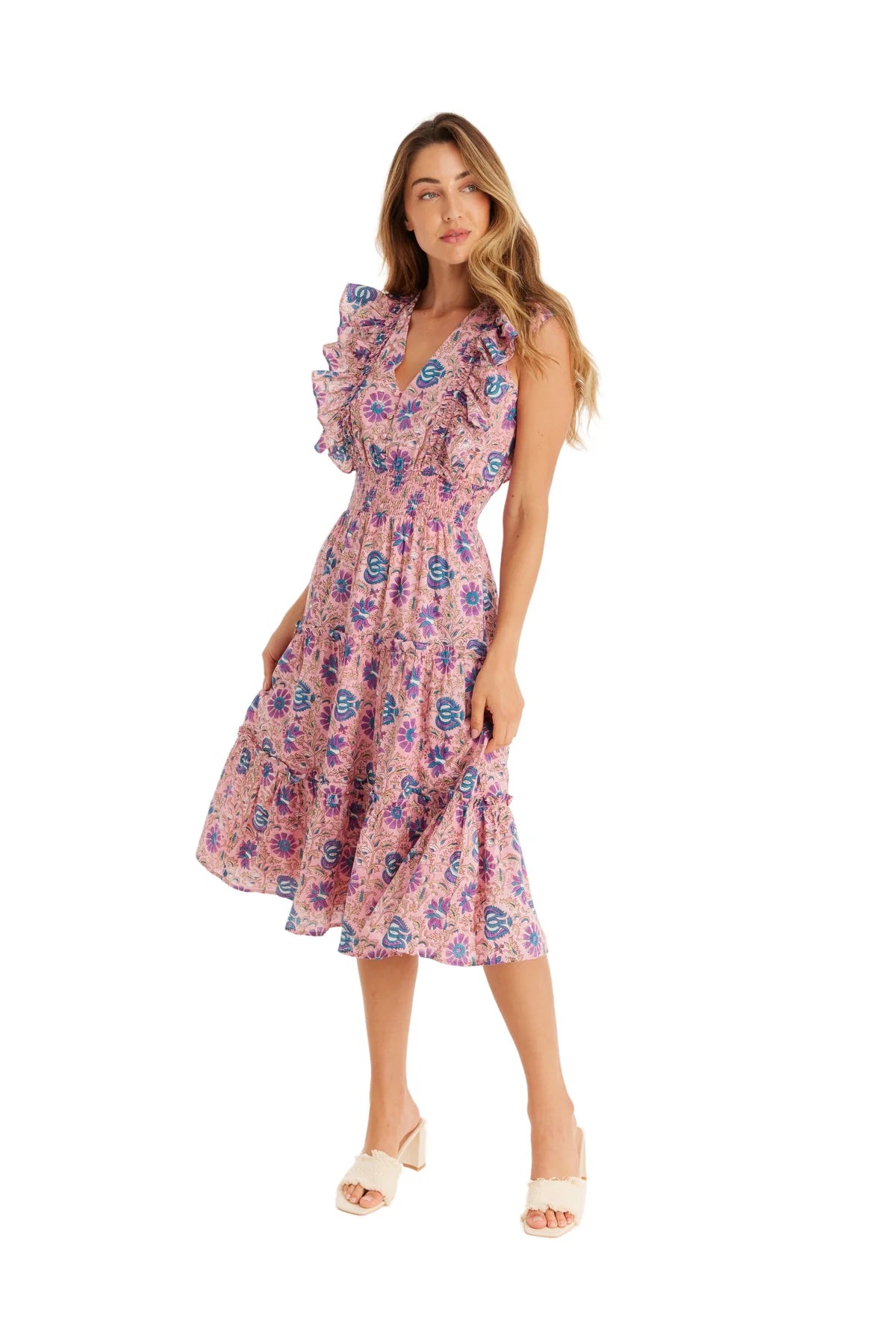 The Ellie Dress is cut in our blush floral cotton fabrication. Designed with a V neck shape leading to bodice buttons and a smocked elastic waist for an easy fit. The midi-length skirt has 2 ruffle tiers. Finished with a ruffle detail at the bodice, we love the free-flowing shape. Fully lined.