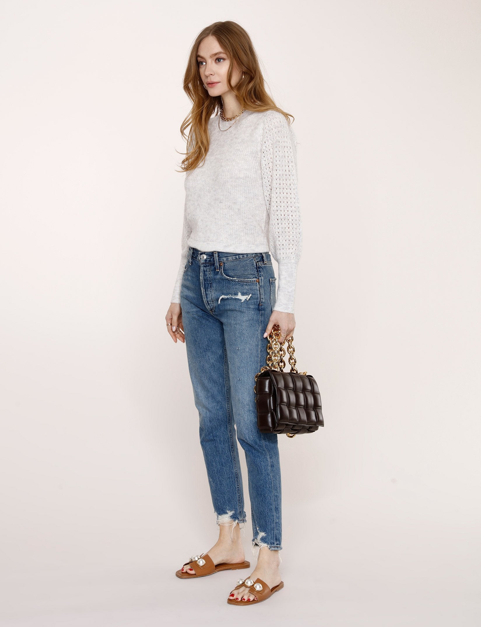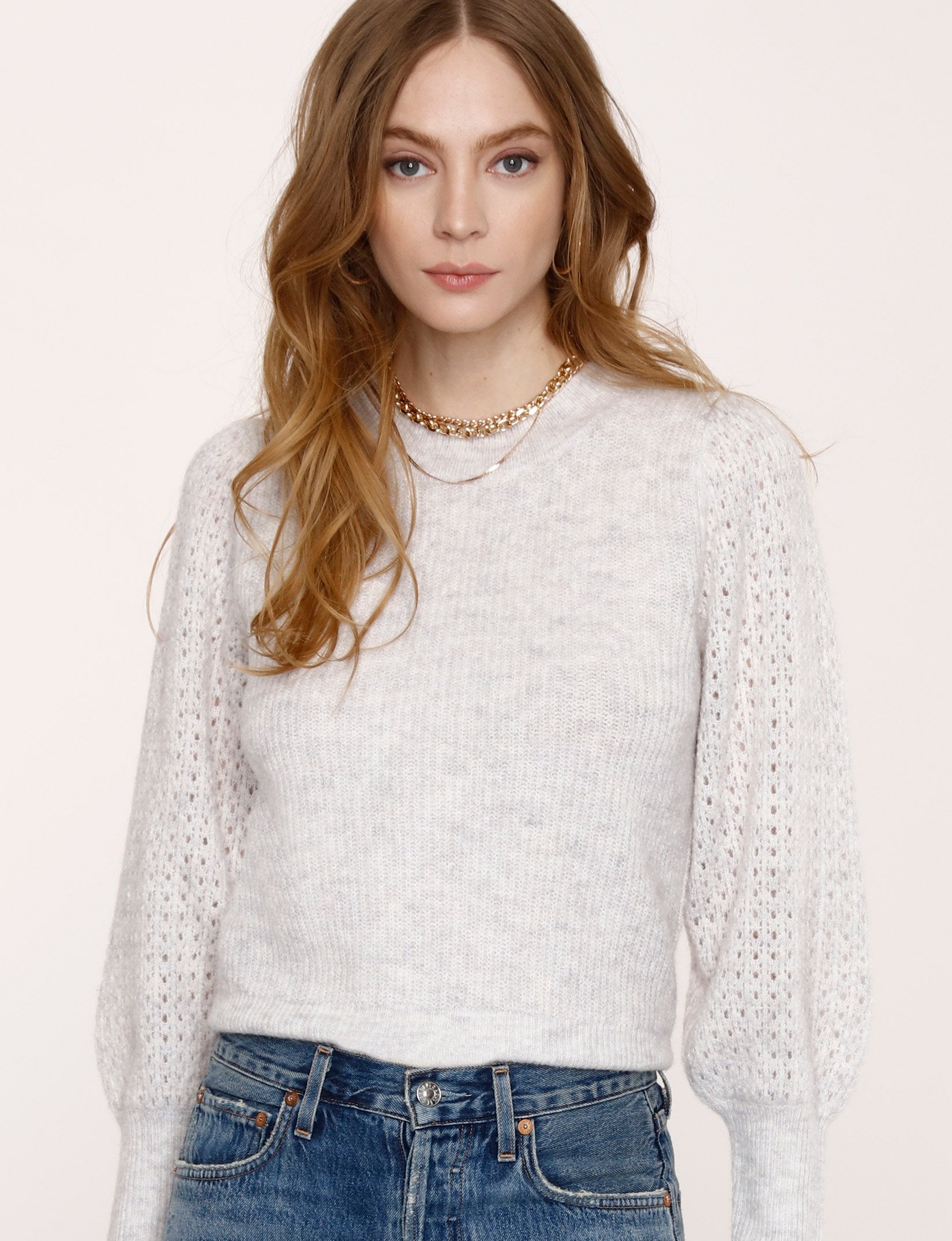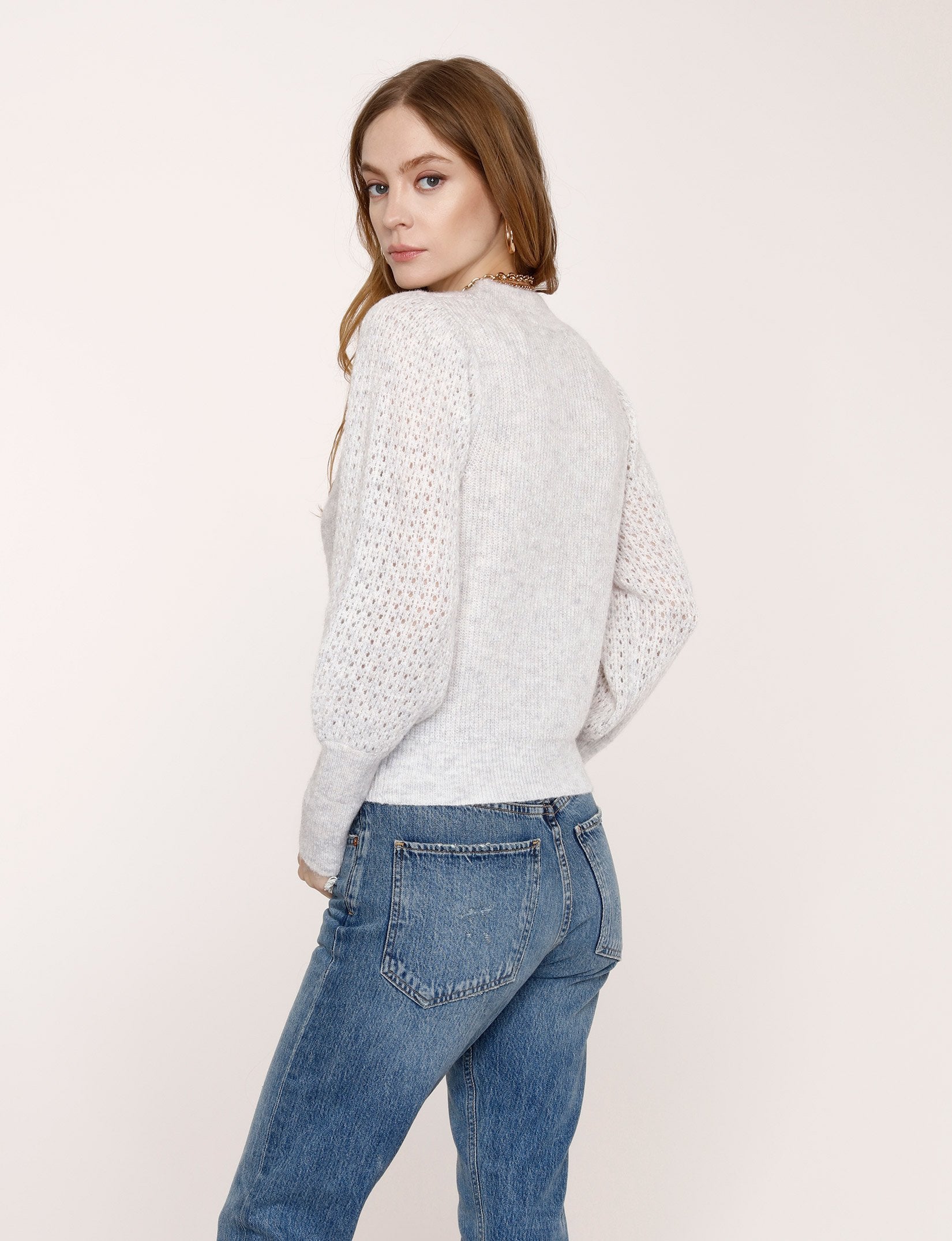 The Avalon Sweater is knitted in a delicate stitch with romantic pointelle blouson sleeves. Knitted in our soft yarn, it's perfectly polished for video calls indoors, and pairs perfectly with jeans for a day out.