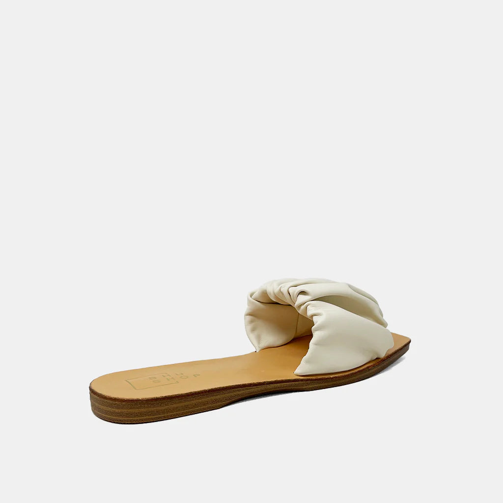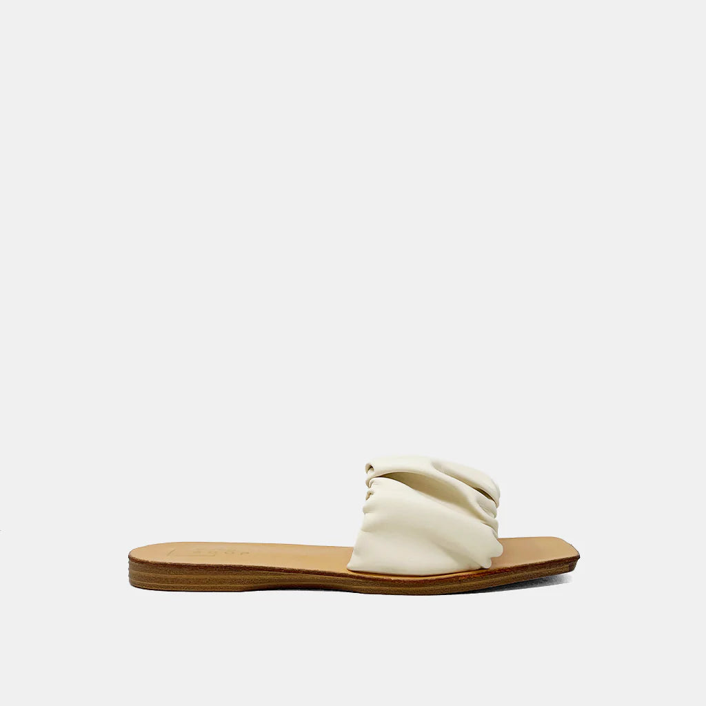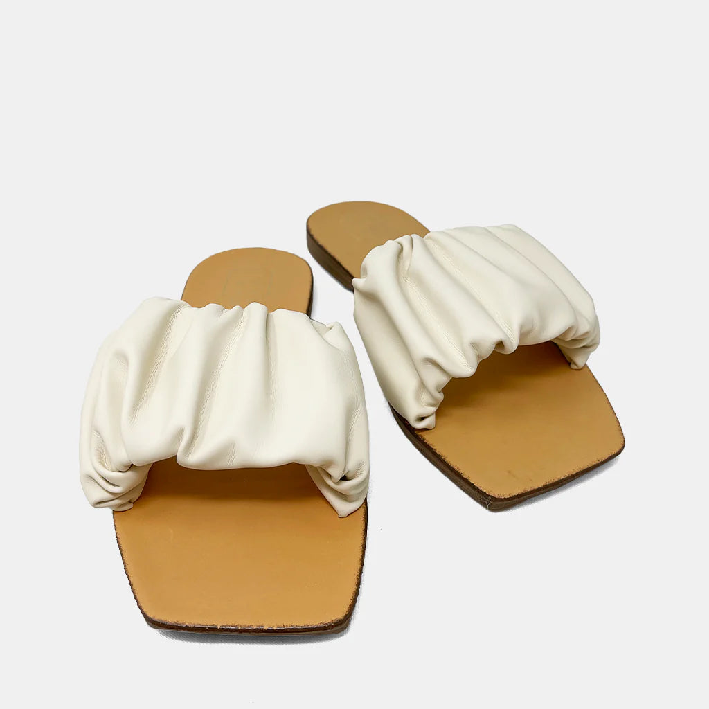 Our stylish BELINDA sandals are made of high-quality faux leather, with elegant ruched straps that wrap around your feet for a snug fit. The modern squared-toe finish adds versatility and fashion to your look. The BELINDA slip-on sandals are both comfortable and durable, perfect for any summer occasion.