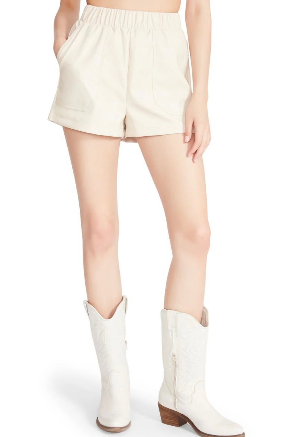 These shorts feature an elastic waist band, pockets, faux leather fabric throughout, and a relaxed fit.