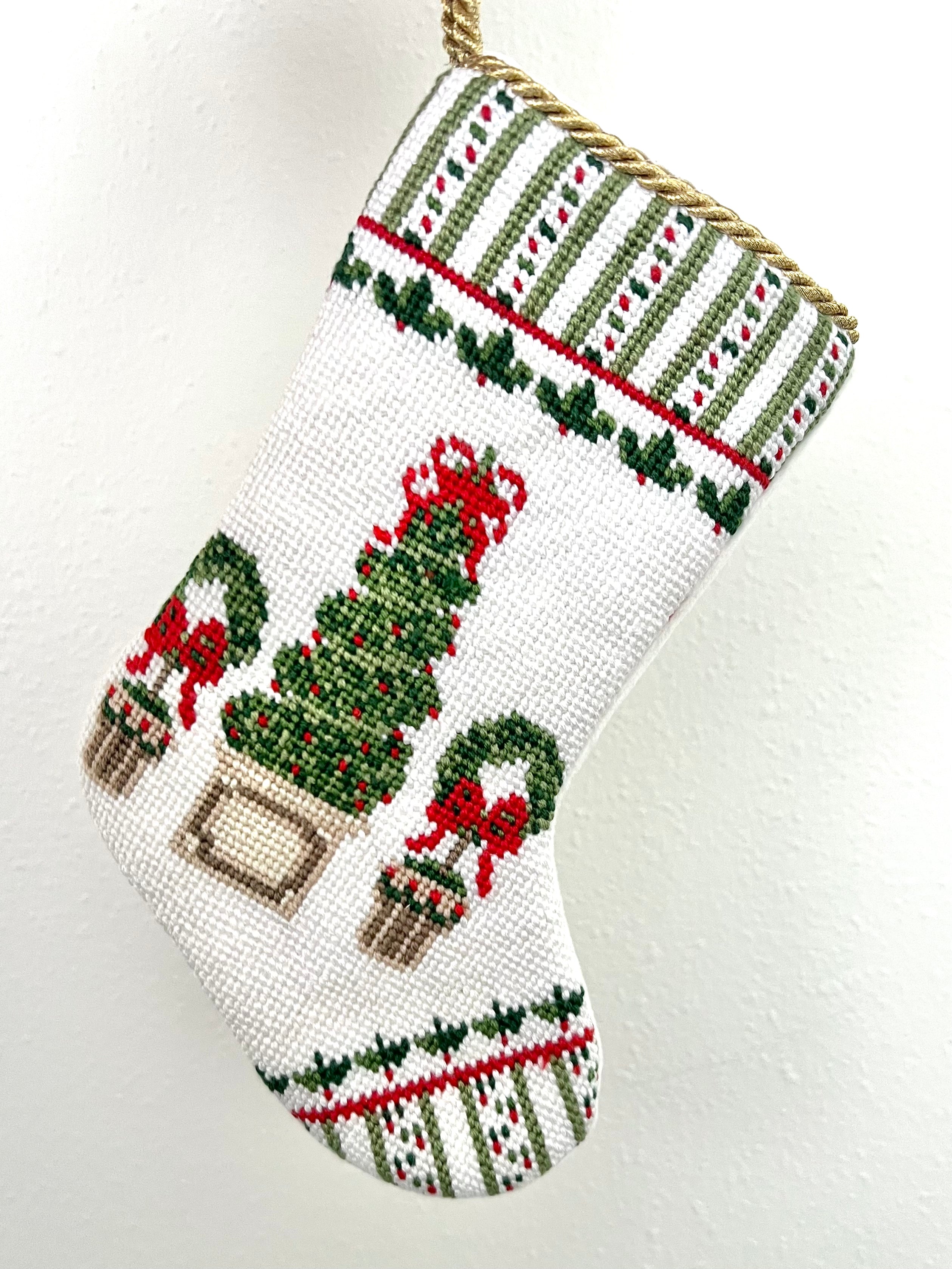 Hand-stitched needlepoint heirloom stockings with cotton threads and velvet backing.