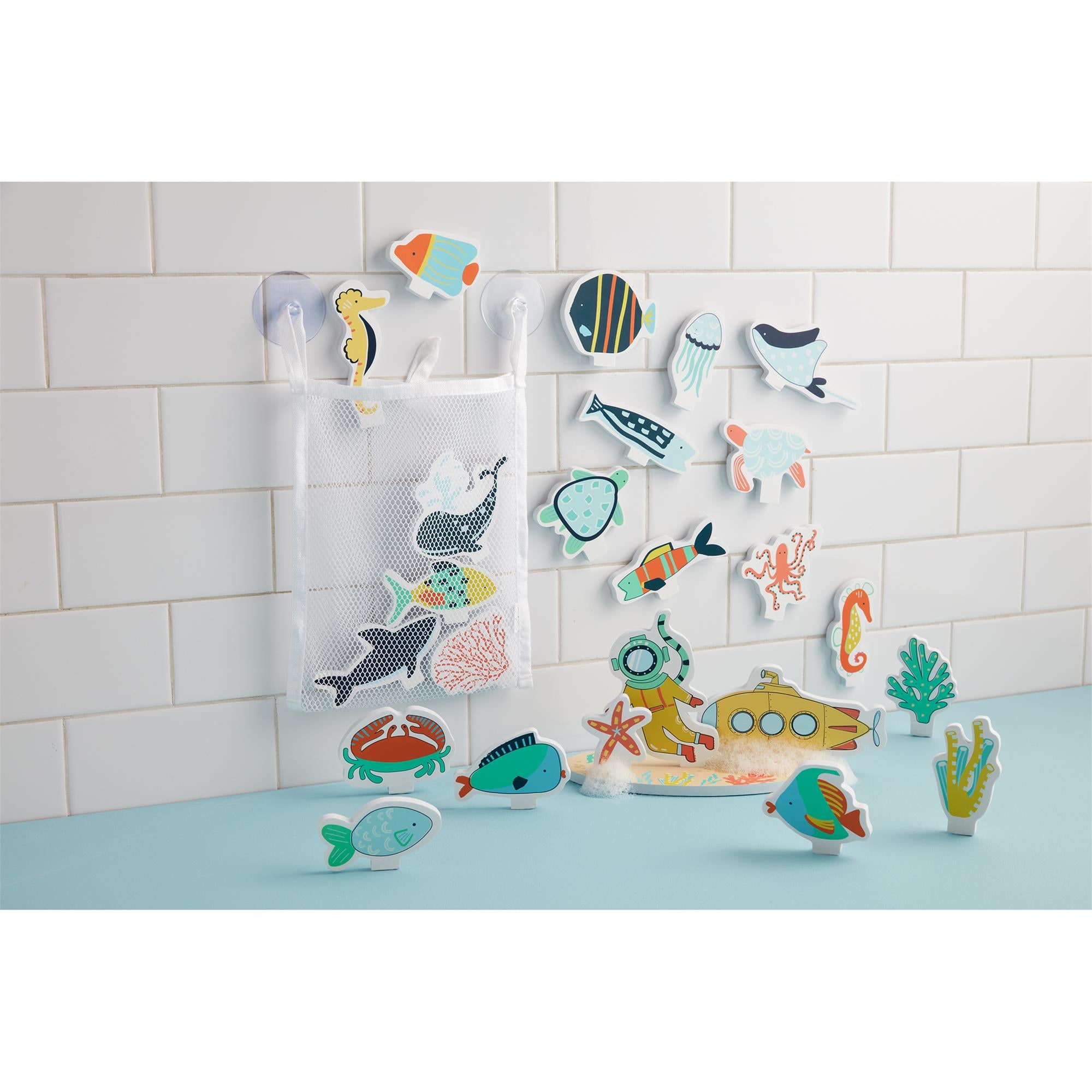 25-piece bath stickable foam shapes. Comes in mesh bag with suction cups. Ages 3+