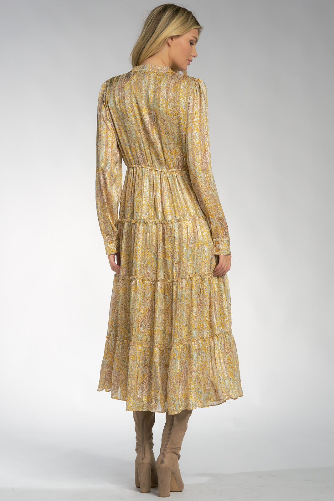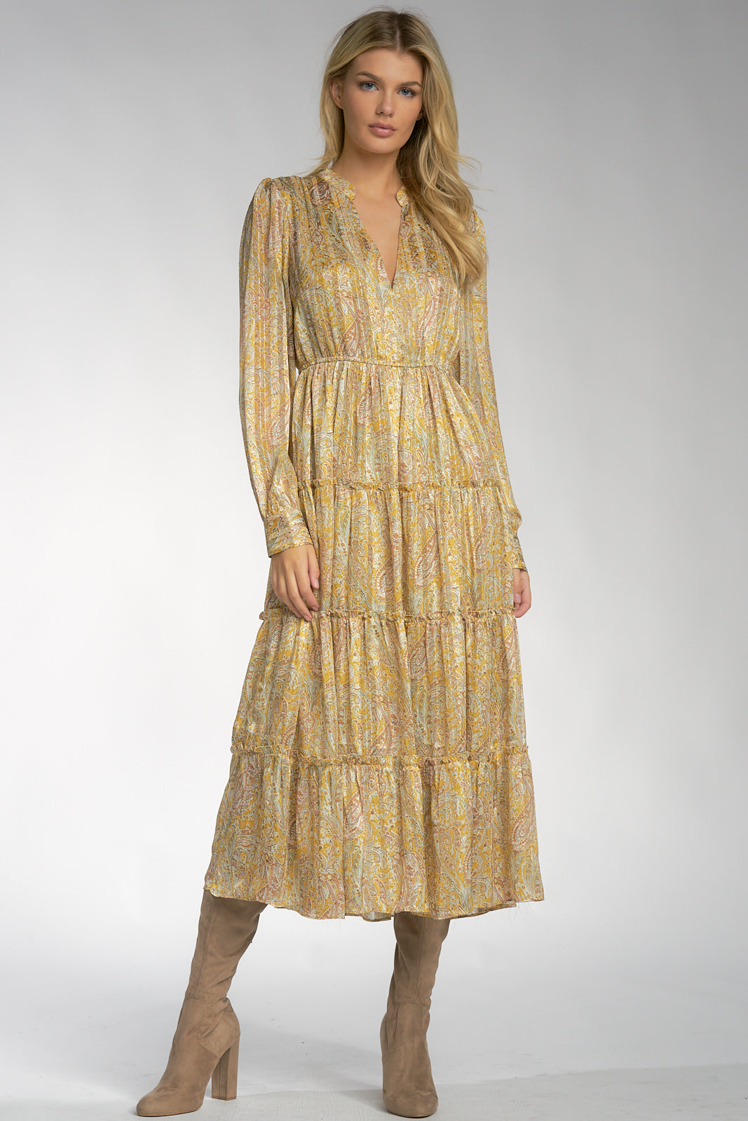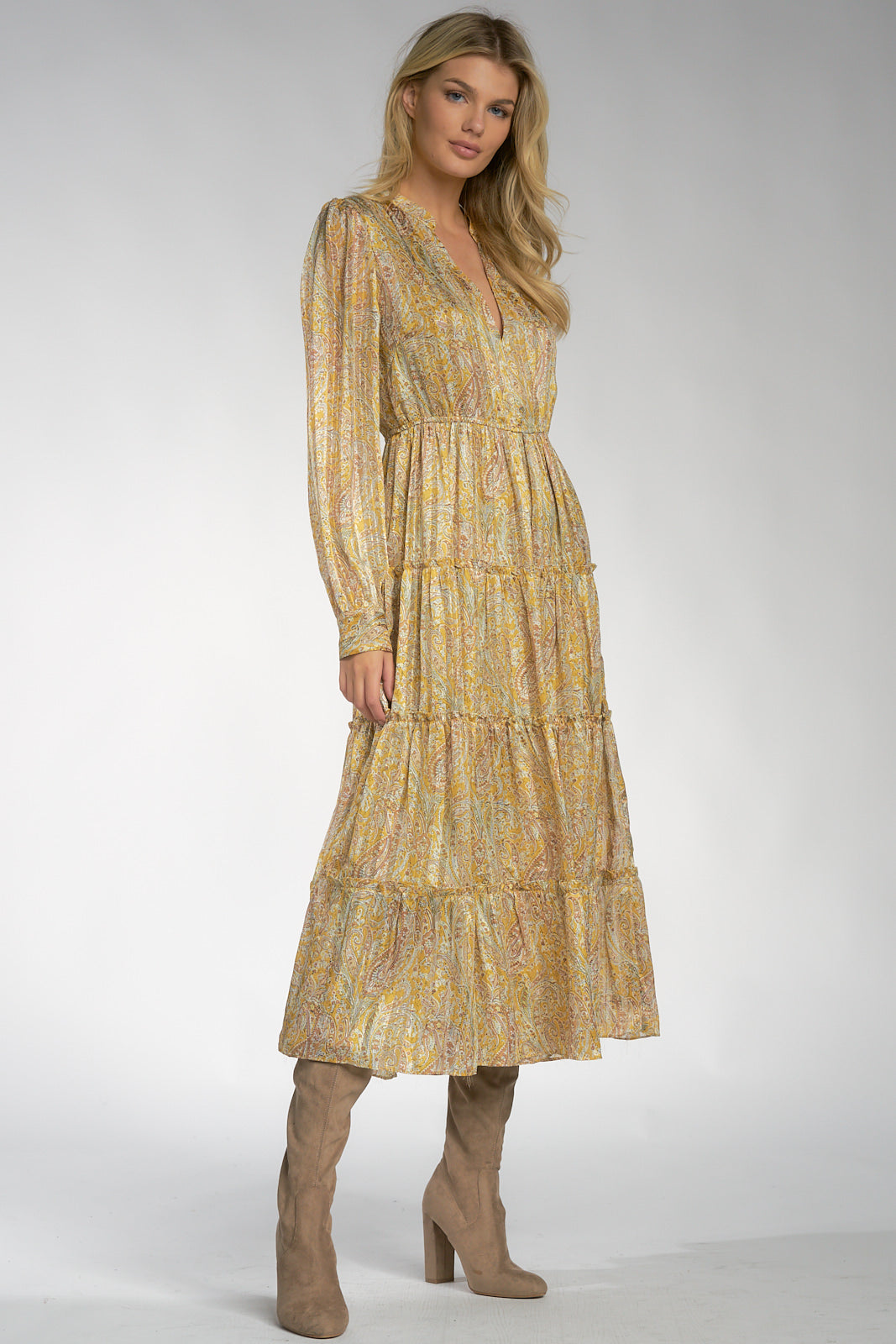 Beautifully designed in our classic chiffon material, this statement dress features a deep v-neckline, flattering waist, and tiered ruffles. Silhouette is flowy and relaxed.