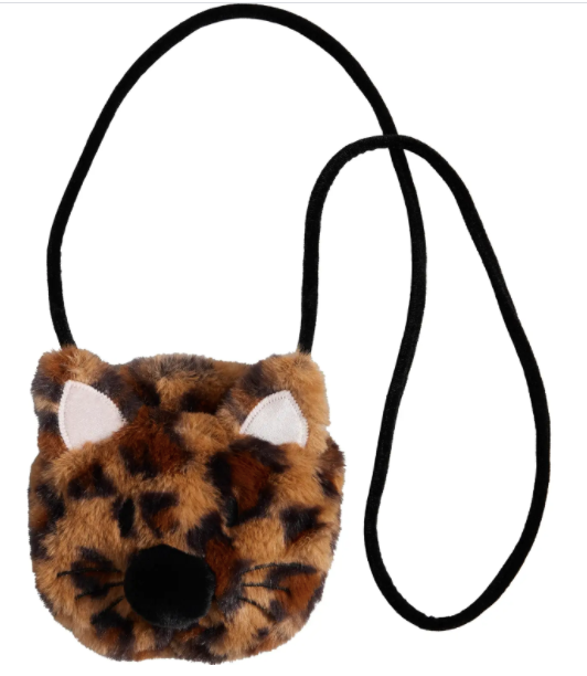 The faux fur cat purse features a detailed leopard print with brown and black coloring. The purse also features a pom nose and a black velvet cord strap. The purse features a fully functional zipper closure.