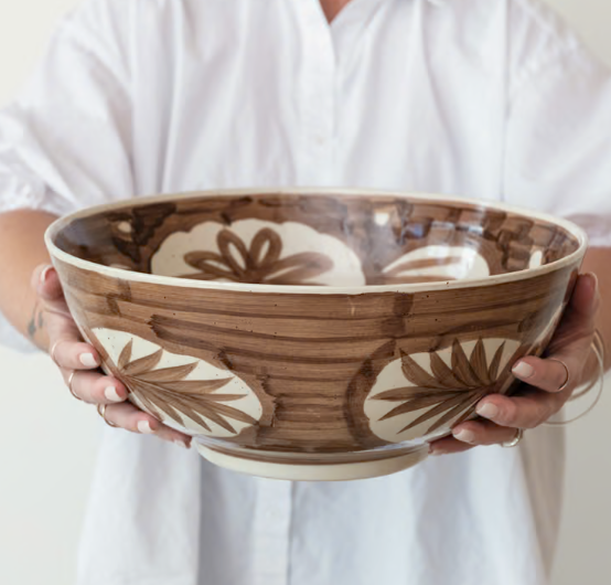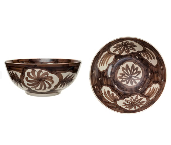 14" Round x 5-3/4"H Hand-Painted Stoneware Bowl w/ Design, Browb & White