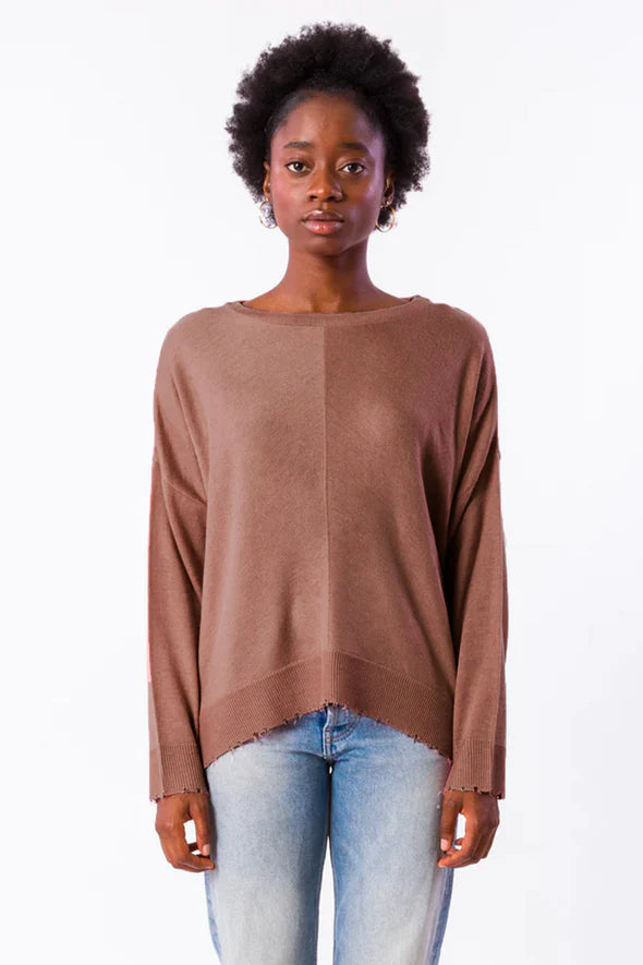 Oversized long sleeve crew neck top with center seam and ripped hem detail