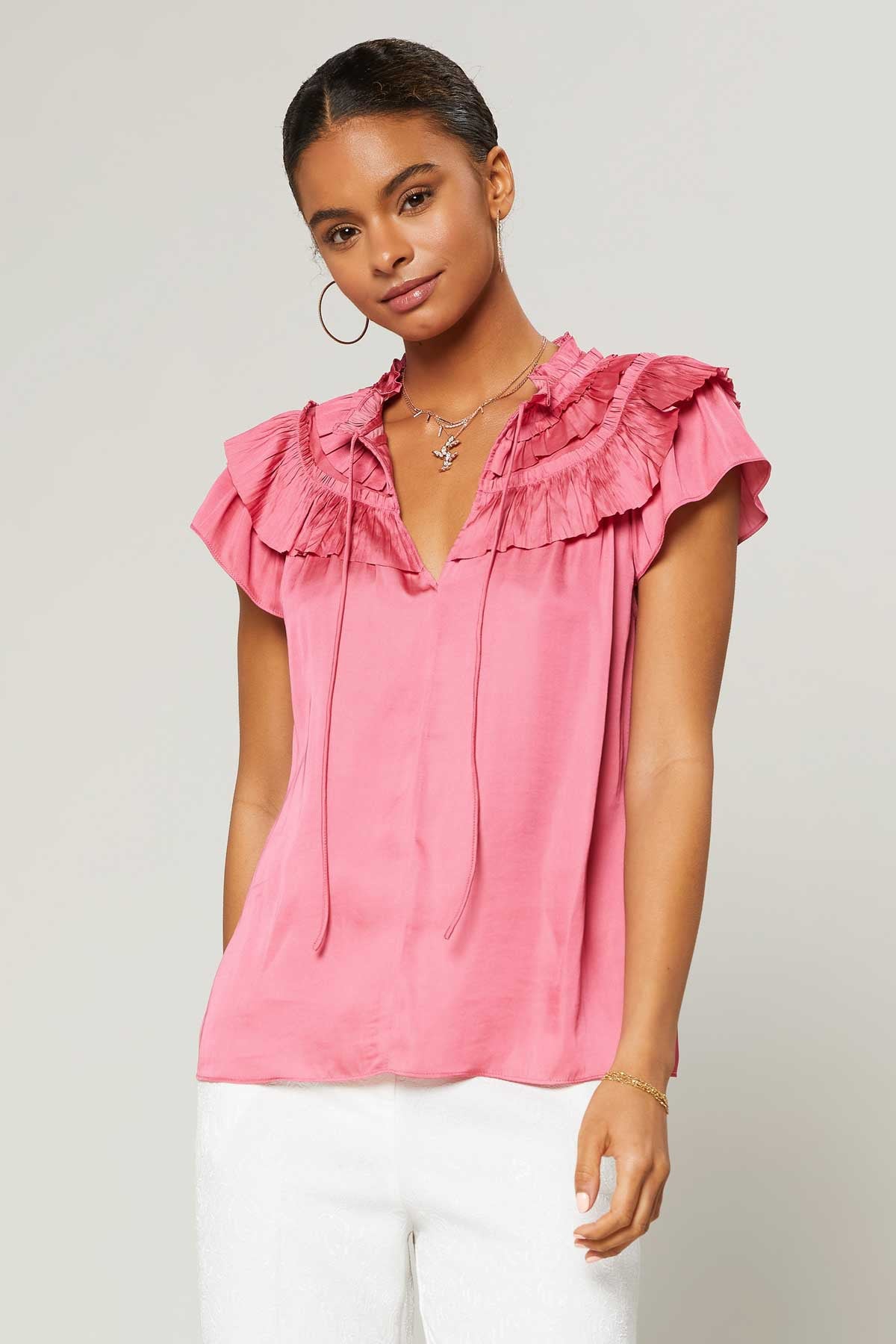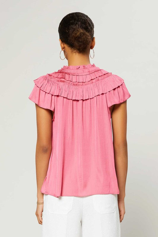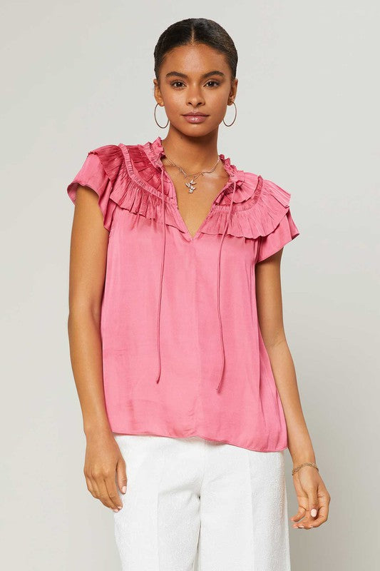 Camellia Shoulder Ruffle Split Neck Top