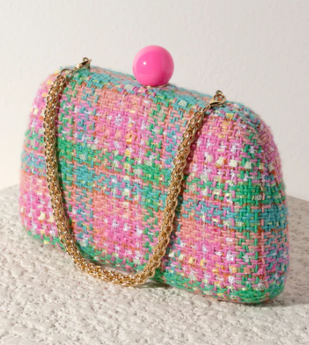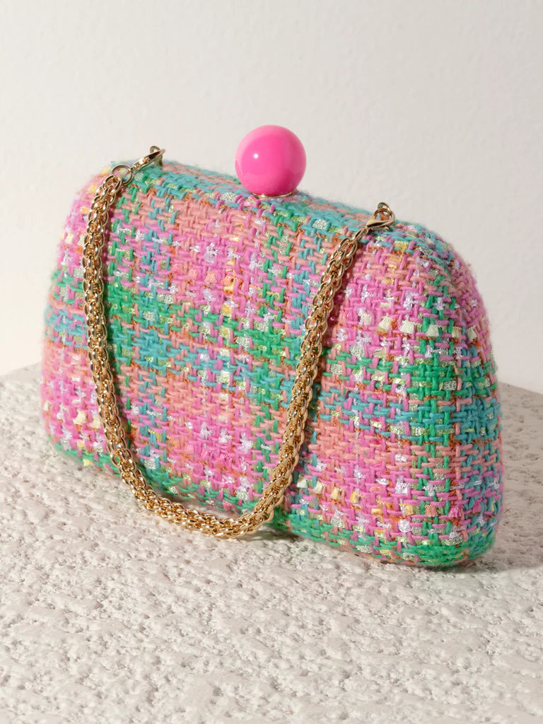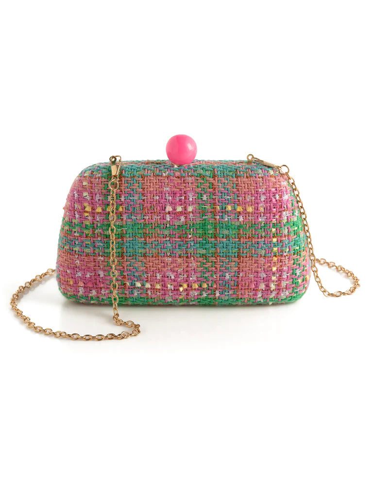 Meet your favorite fall clutch, the Lana Minaudiere from Shiraleah. This versatile bag features a trendy tweed texture in a chic pink and green color pattern with a pink push lock closure. With its interchangeable single handle and cross-body chain, this little purse can be worn as a clutch, a mini bag, or a cross-body! The Lana Minaudiere effortlessly exudes style and sophistication. Pair with other items from the Shiraleah collection to complete your look!