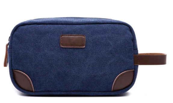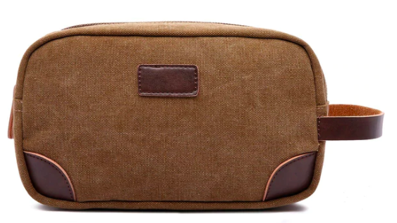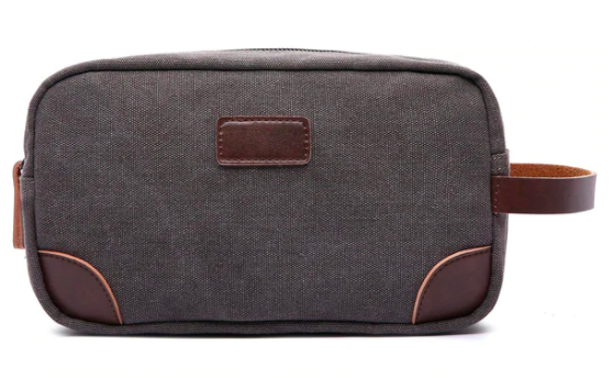 Perfect for vacations, business trips, and other travels, this durable men's canvas and leather toiletry bag will keep all his necessities handy. This bag features a water-resistant canvas, a leather strap handle, and a wide zipper opening. Care instructions: spot clean, air dry. Manly colorway options available. Functional and stylish. Mad Man, masters of men's gifts. Material: Leather and Canvas. Dimension: 9.5" x 4" x 5.75".