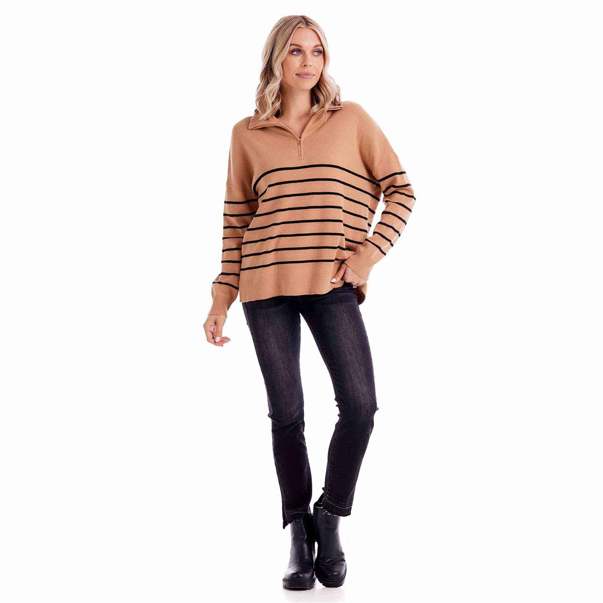Poly blend knit pullover features three-quarter zip neckline with ribbed collar, and striped details. Measures approximately 25" from shoulder to hem on size small.