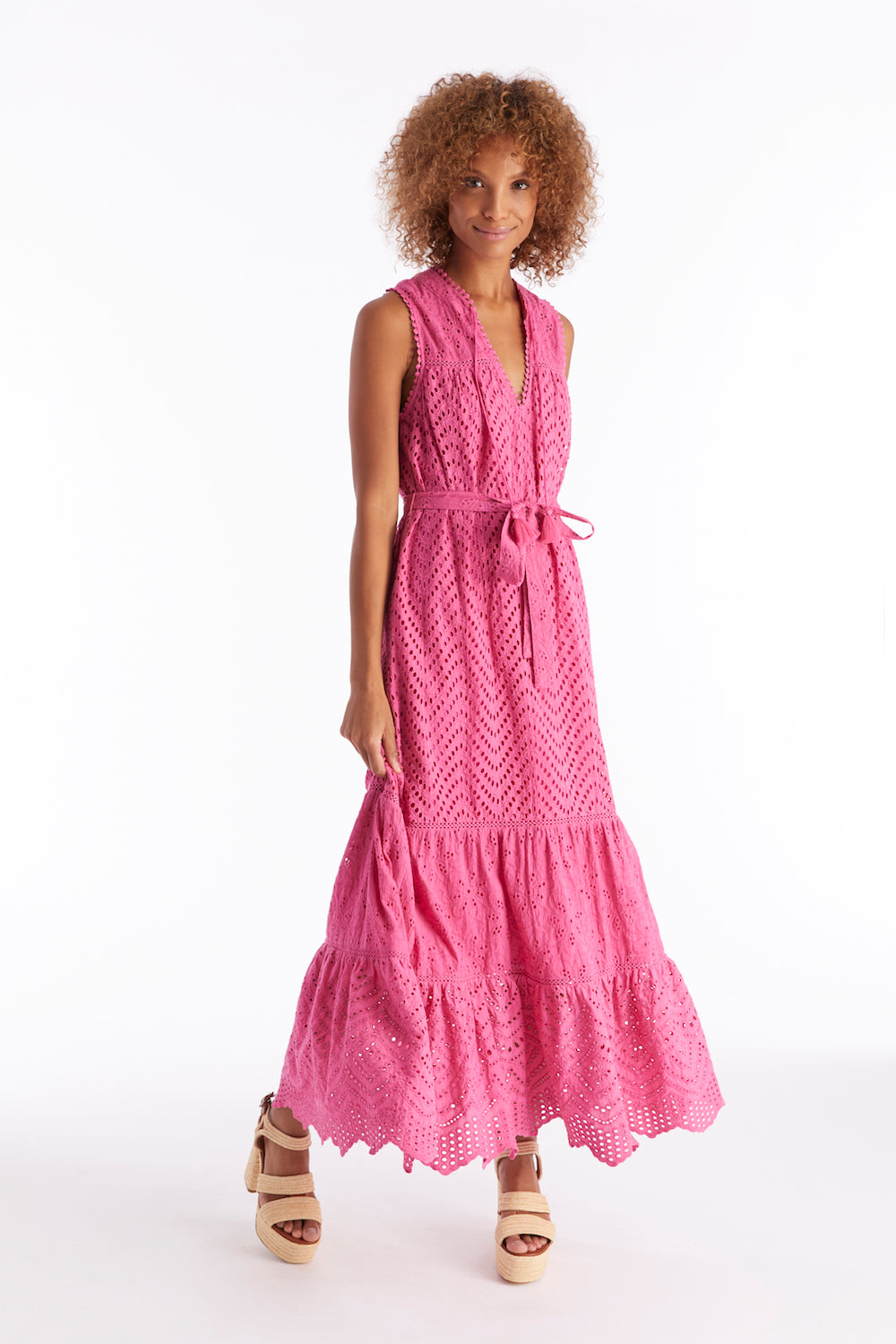 Our signature Estelle Maxi Dress is back in a striking fuchsia pop of color. Defined by its mix of embroidered eyelets and lace trims throughout, the detailing throughout this floor sweeping style is breathtaking. Cut in a split v neckline with tasseled ties and a sleeveless shape. The body-skimming silhouette offers a relaxed waistline that can be cinched in with the matching belt. Ruffles flow down the bottom hem offering a voluminous finish with scalloped detailing. A center back zipper allows for a pull-on style and the dress is fully lined.