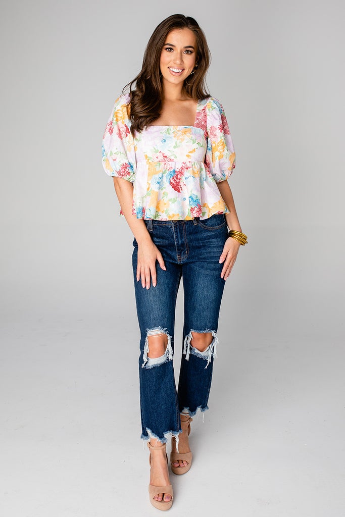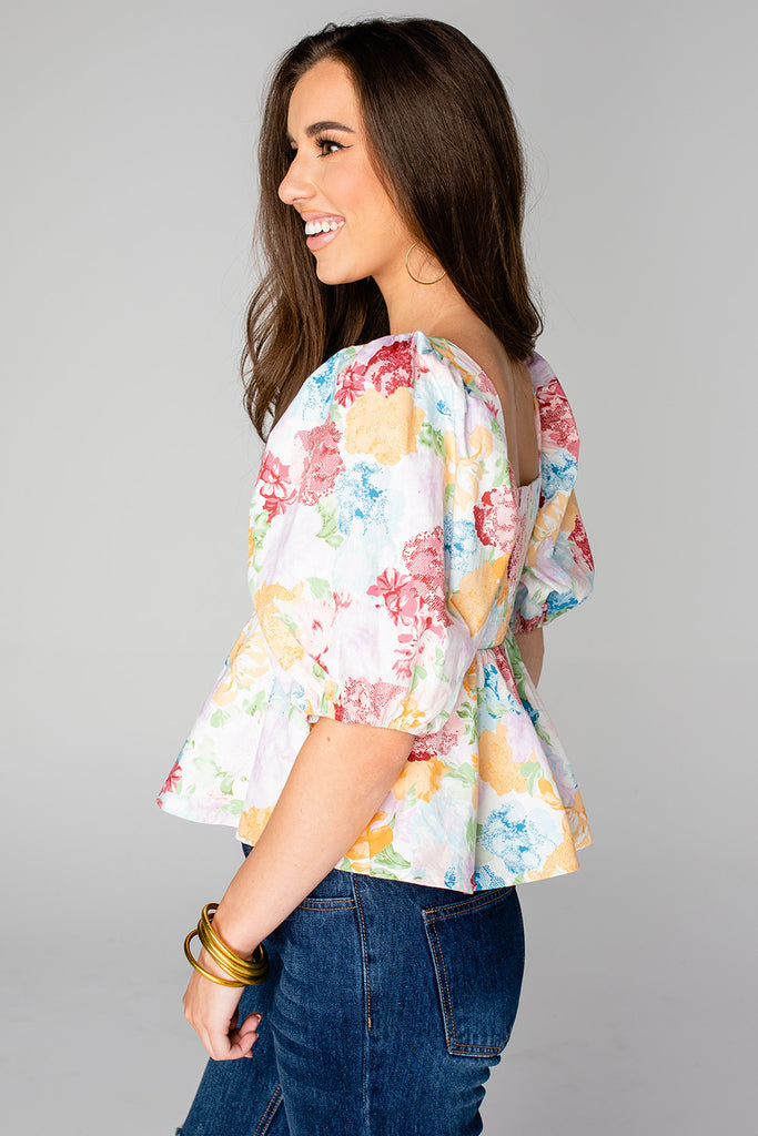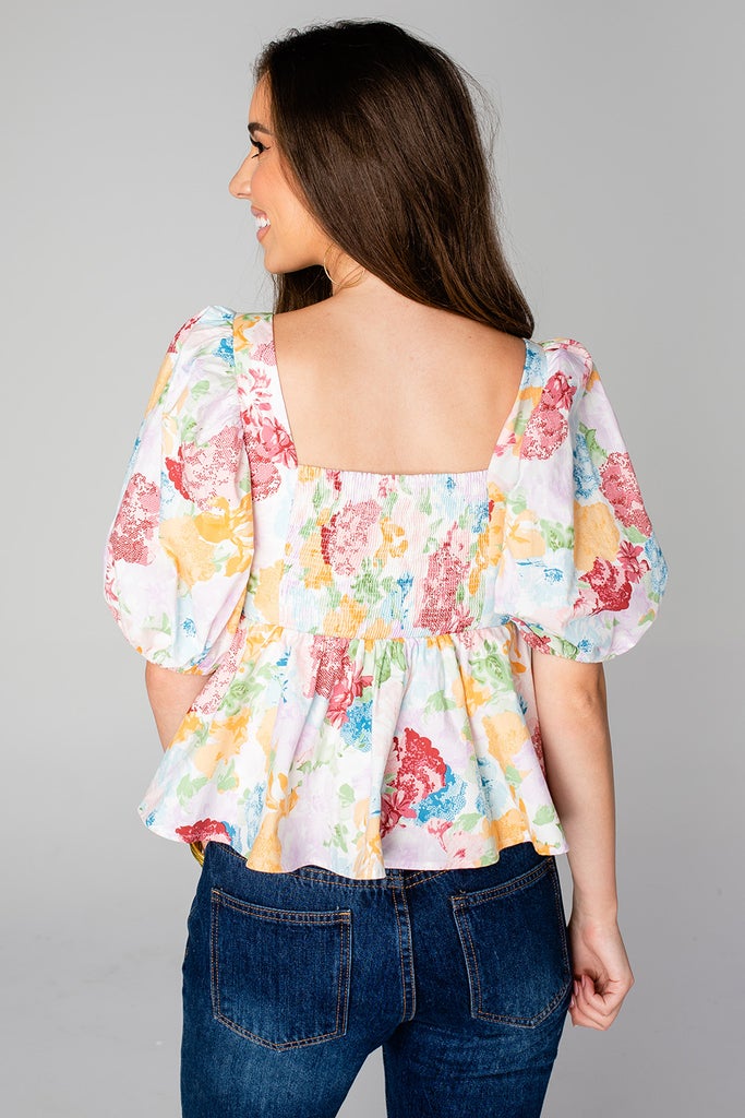 Life's a party, so dress like it in our vibrant Alana top featuring puff sleeves, high-quality material patterned with our new Carnation print, a square neck line, smocked back, and peplum silhouette. Style with your fav pair of cropped jeans and wedges!