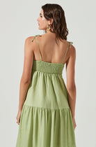 This midi dress features a square neckline, smocked bust and tiered skirt. Self-tie shoulder straps. Side pockets.