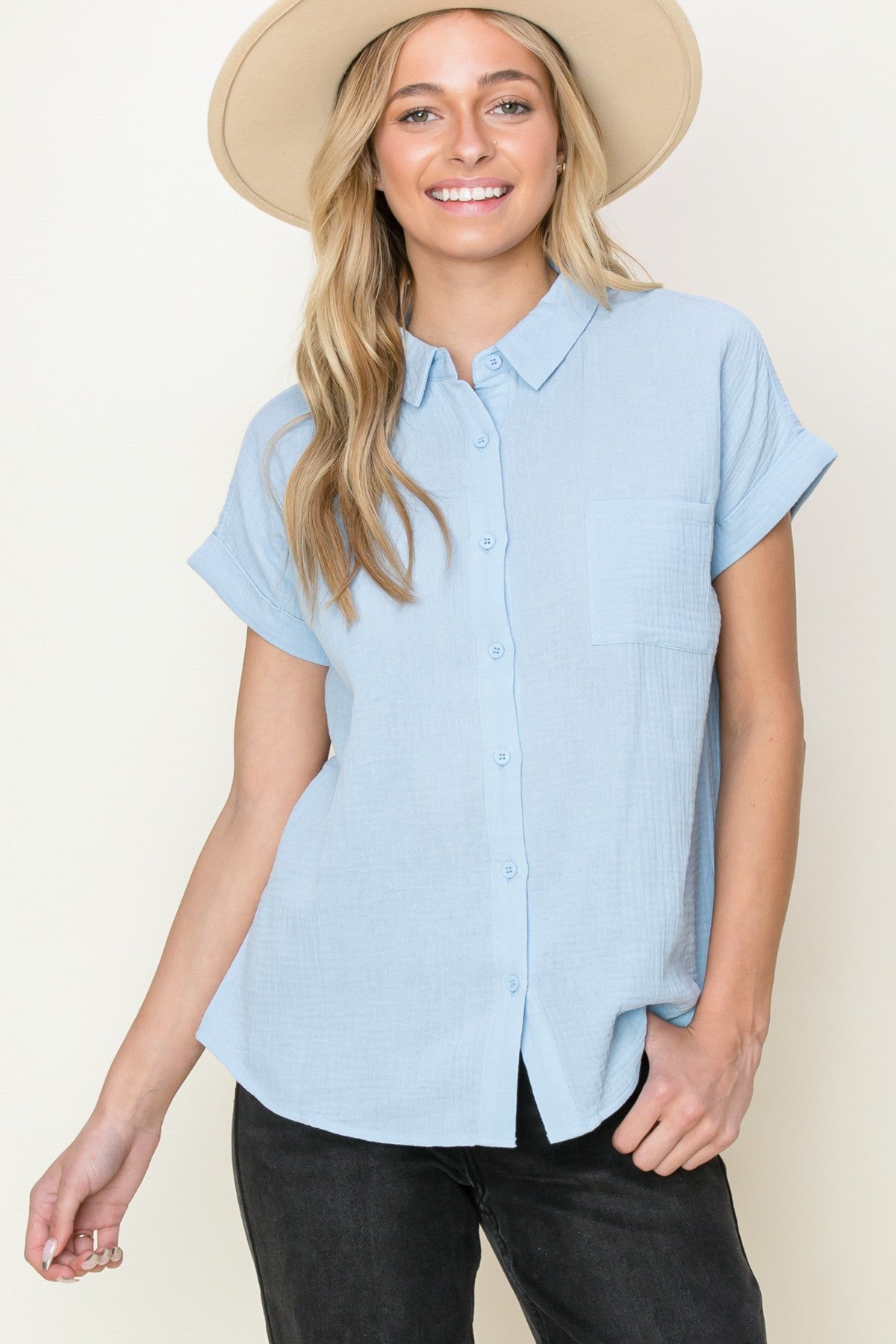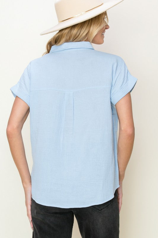 Basic Collar, Button Closure, Short Sleeve, Chest Pocket, Solid Gauze Shirt