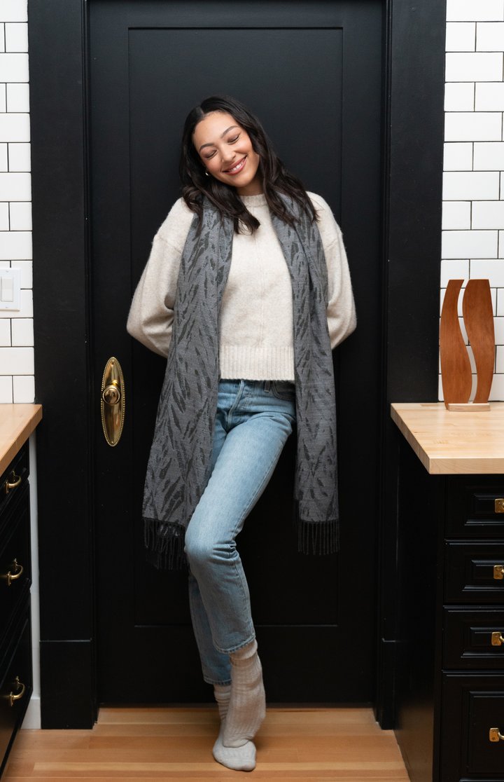The Revival scarf is made of a soft yarn that is perfect for cold weather layering. Features include a reversible jacquard pattern and fringe along the hem.
