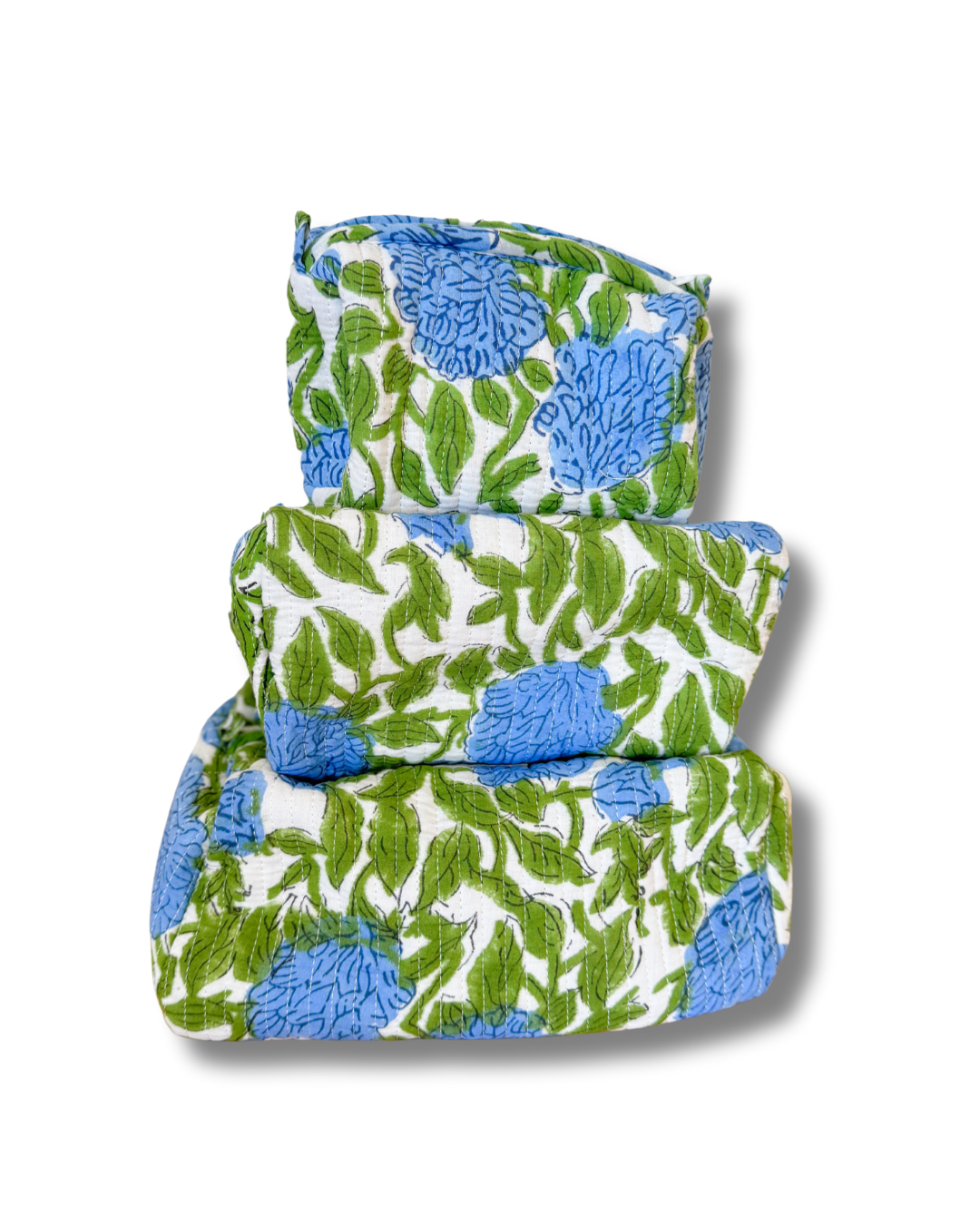 The large cosmetic bag has pockets on the inside, the medium and small size cosmetic bags are lined and also have small pockets. All zippers are detailed with a tassel. The block printing process may have variations in color, printing, and fabric as part of the handmade process which is what makes each product unique.