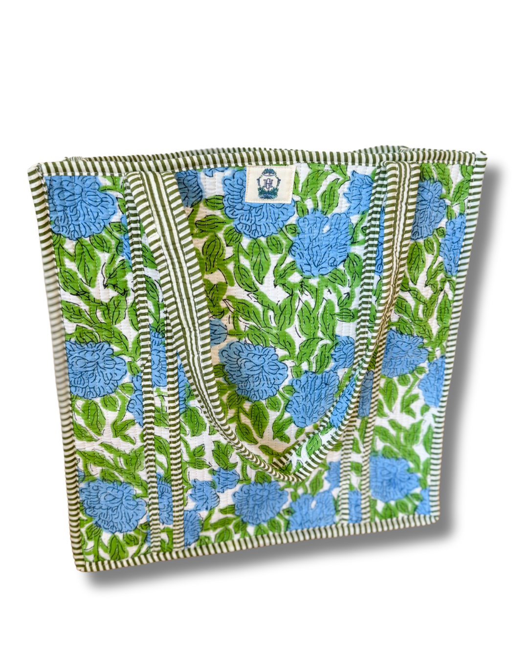 Bag measurements: approx. 15” x 16” Sizes may have slight variations as totes are handcrafted. No zipper Includes an Inside pocket for phones, etc. The block printing process may have variations in color, printing, and fabric as part of the handmade process which is what makes each product unique