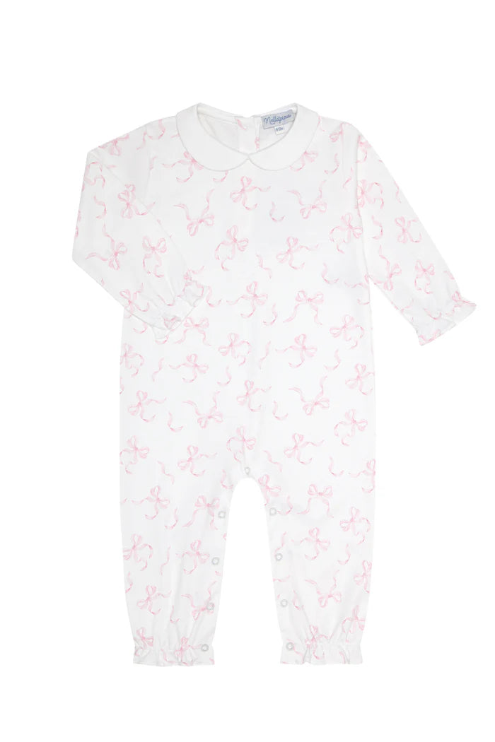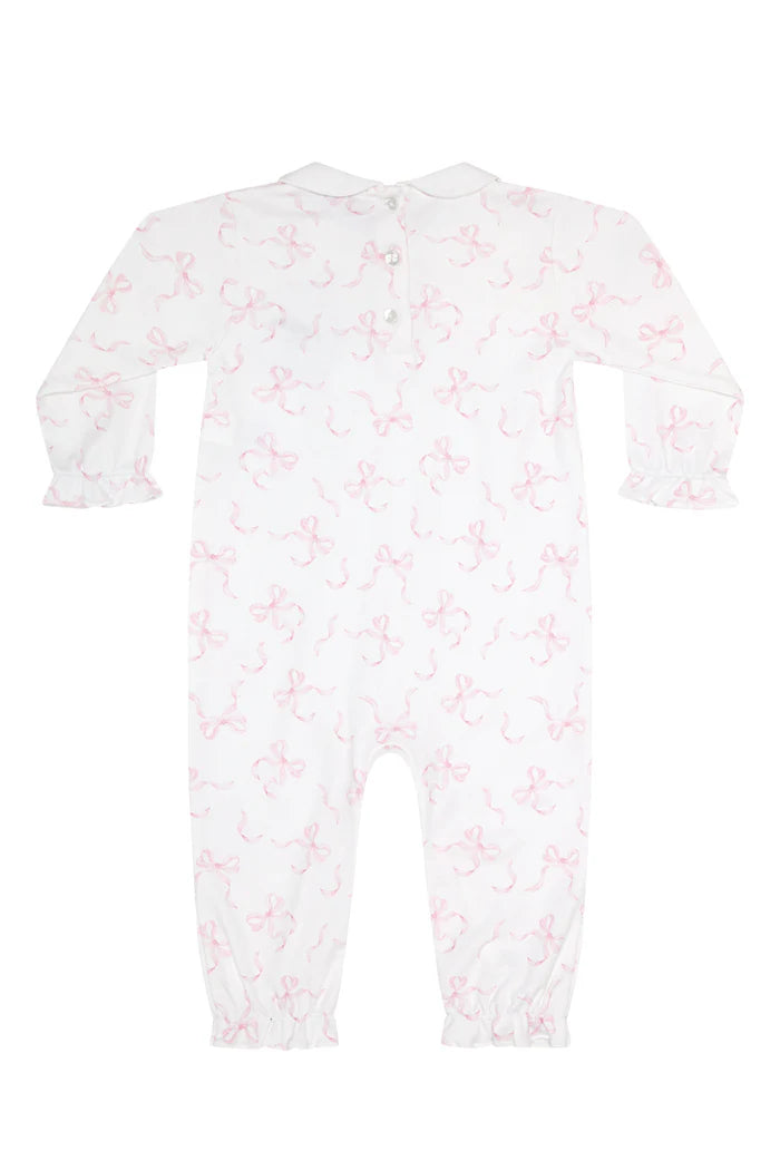 This long-sleeve romper is a cozy essential for cooler days. Thoughtfully designed with snap closures for easy diaper changes, it’s made from breathable Peruvian Pima cotton and covered in our soft Charming Bows print. Perfect for lounging, tummy time, or sweet strolls outdoors.