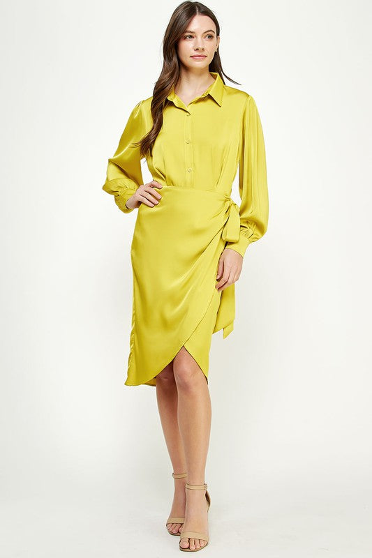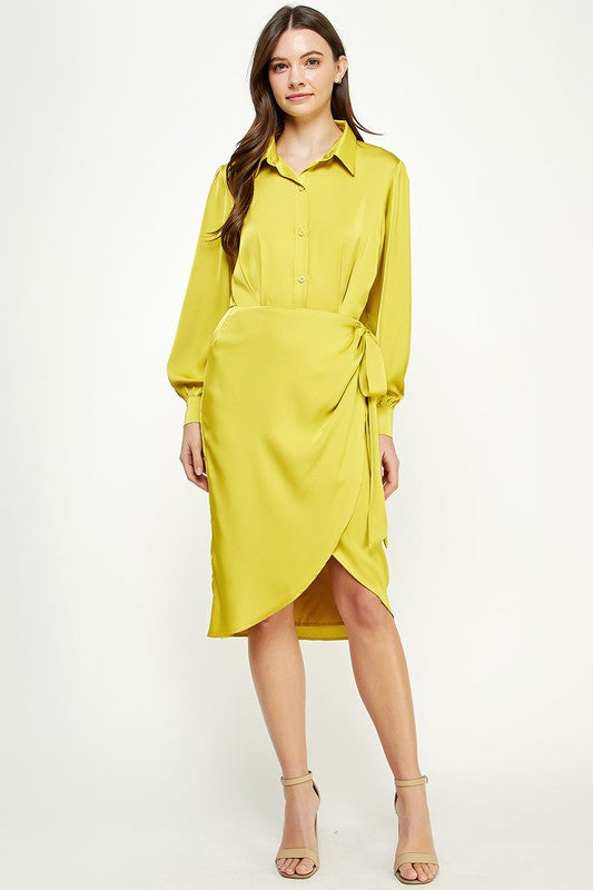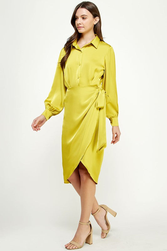 Side tie midi shirt dress in satin fabric. A classy dinner outing staple, this midi dress features a classic collar, cuffed long sleeves, button up top front, and a wrap skirt that buttons and ties at the side into a long side detail.