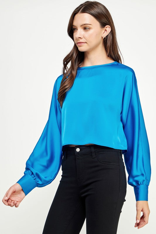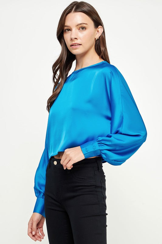 Long sleeve blouse in satin fabric. This style features a round neckline, relaxed long sleeves with buttoned cuffs, and a keyhole with button closure at back.