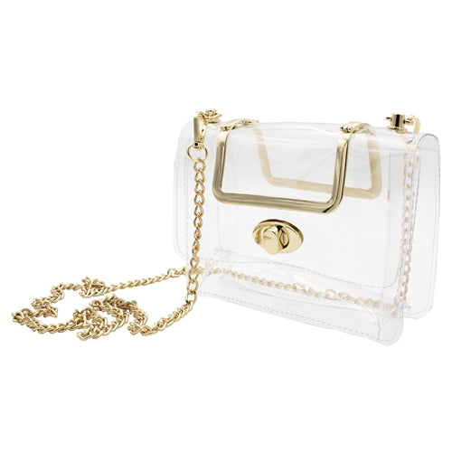 Our stadium compliant crossbody features a clear PVC body with gold hardware accents and a beautifully timeless accent chain. Featuring two top metal handles, flip them up for a cute clutch or flip them down for added style to your clear purse. The main compartment includes a turn lock closure for securing your personal items within.