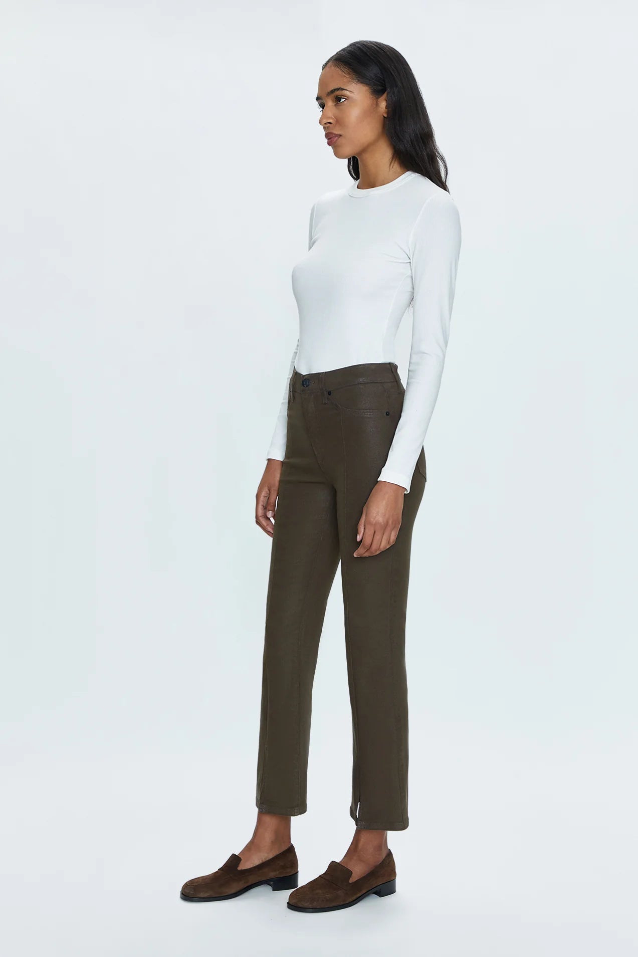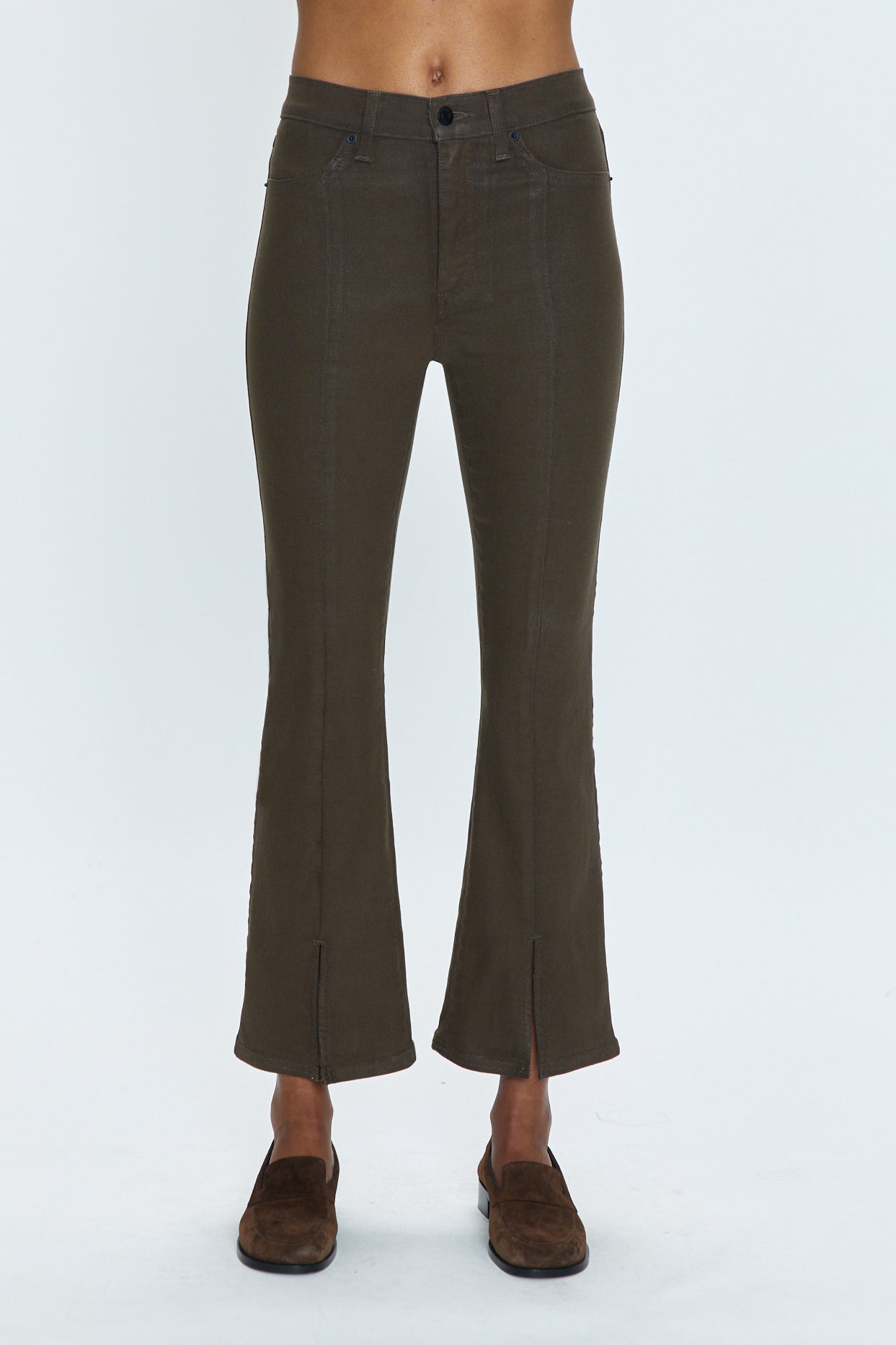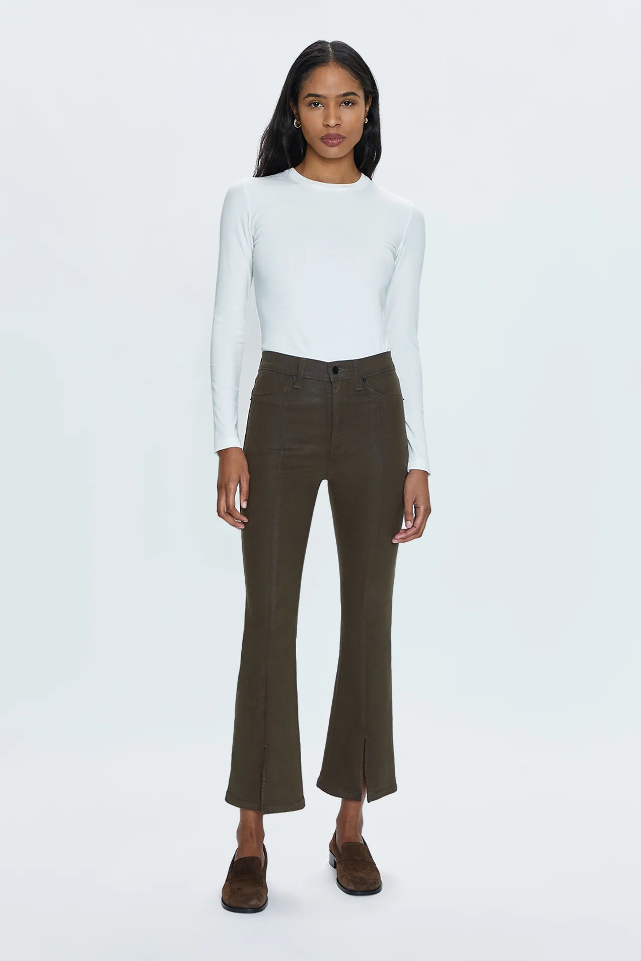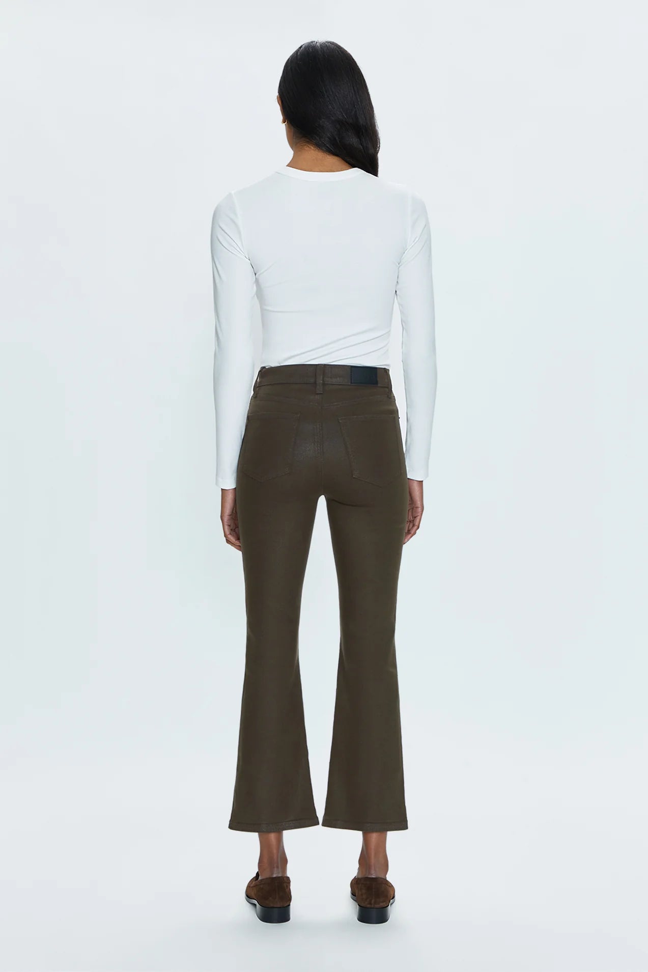 The best selling bootcut silhouette with a high rise waist and cropped ankle hem with a clean finish. Crafted from a super stretch coated denim fabrication, and offered in a natural warm brown colorway.