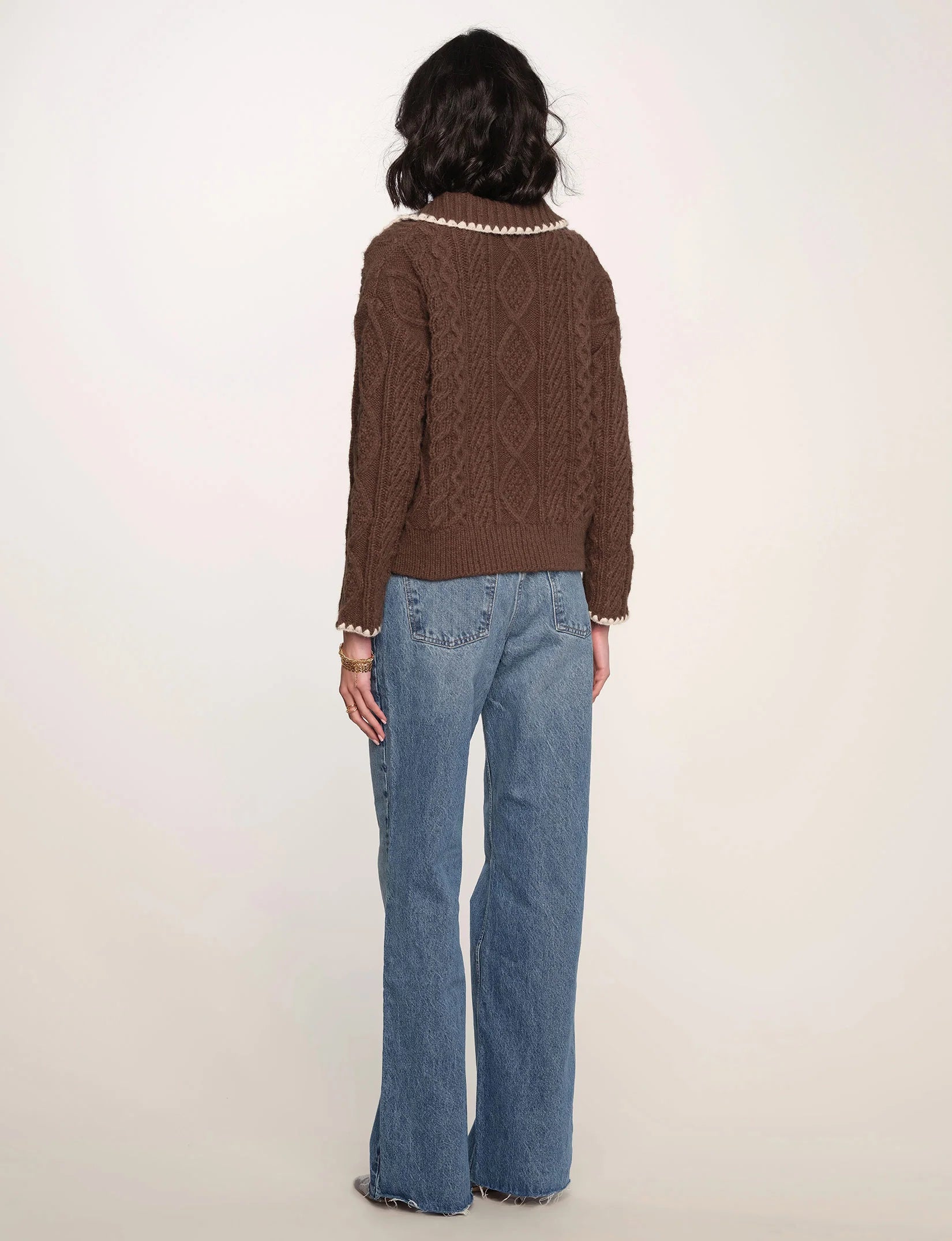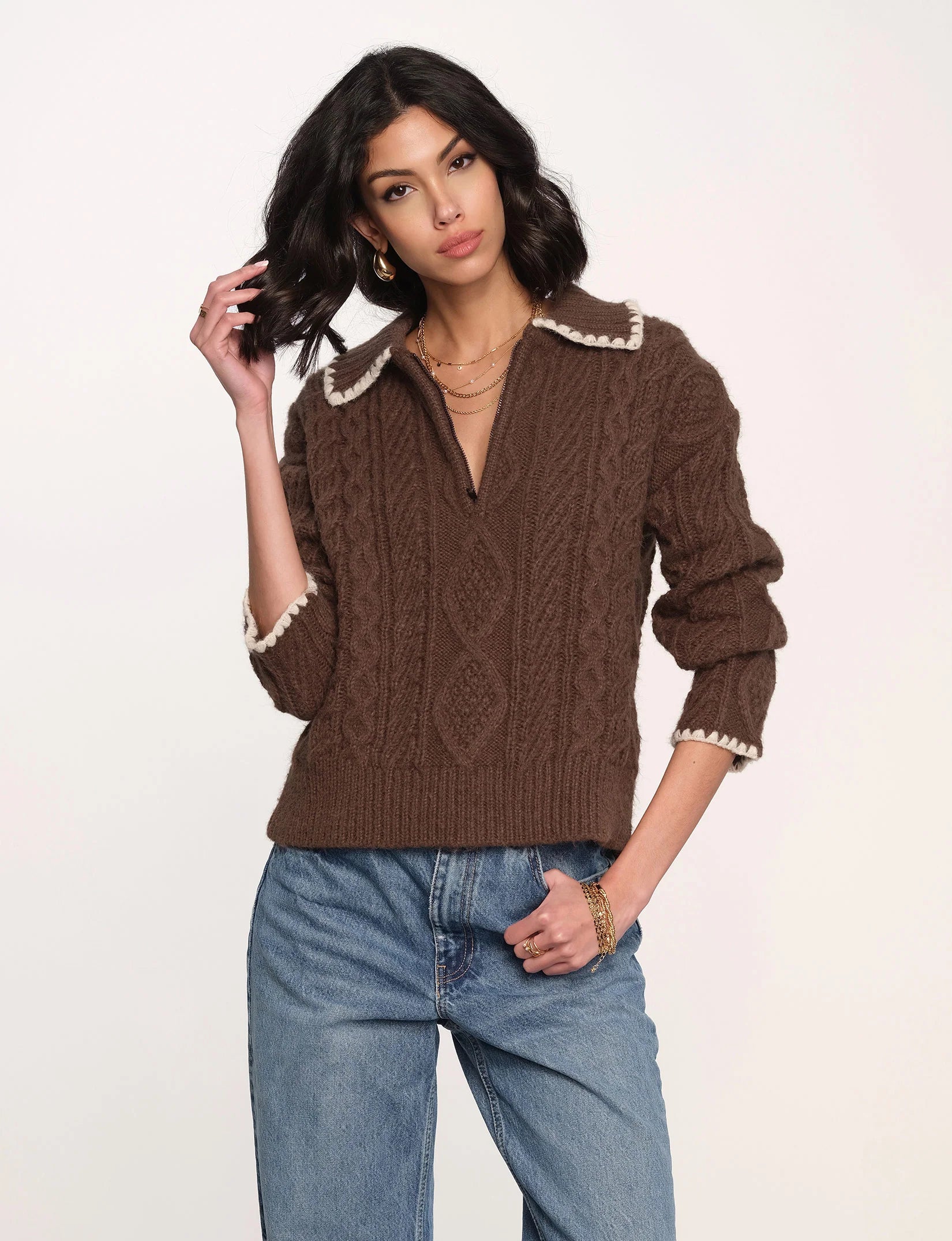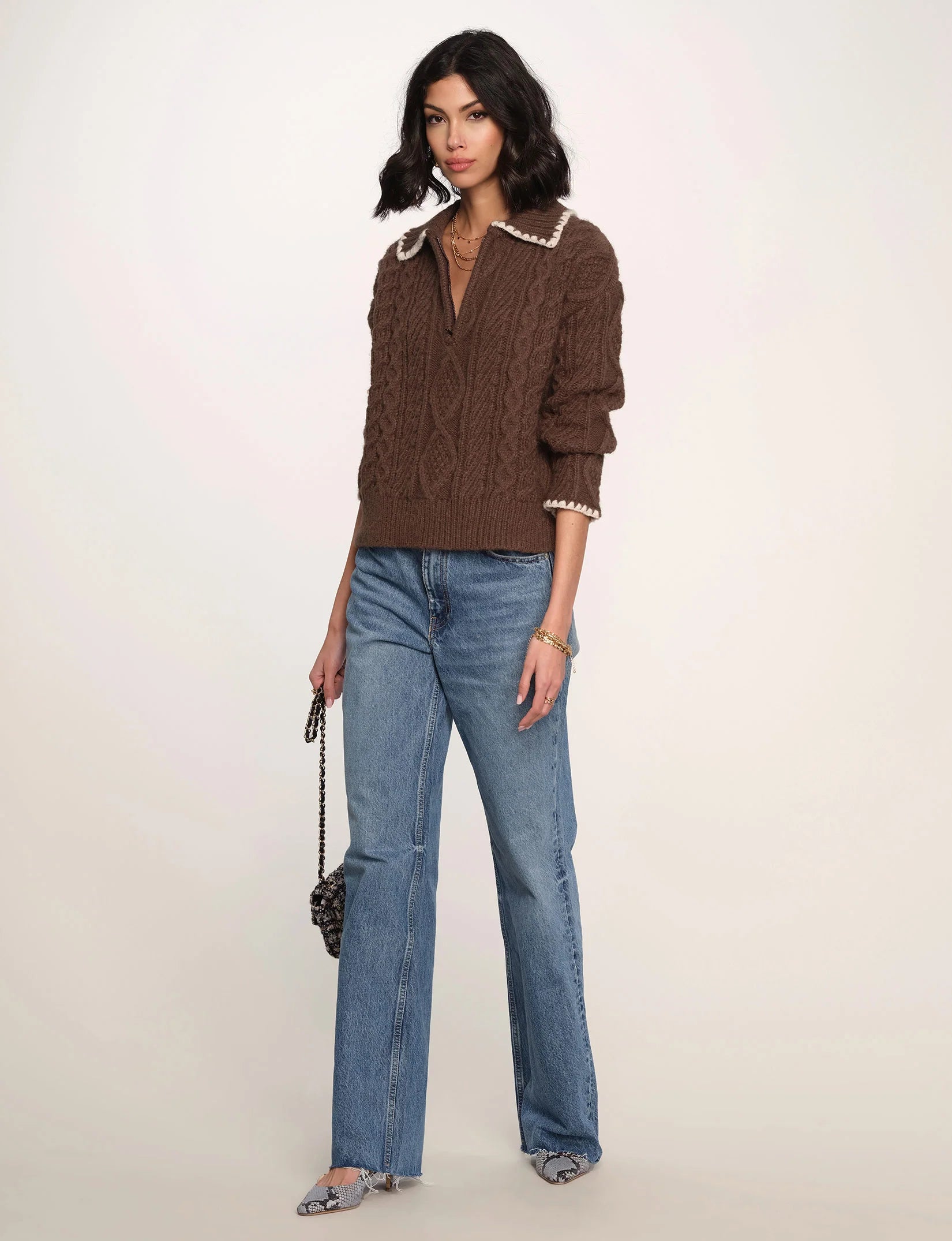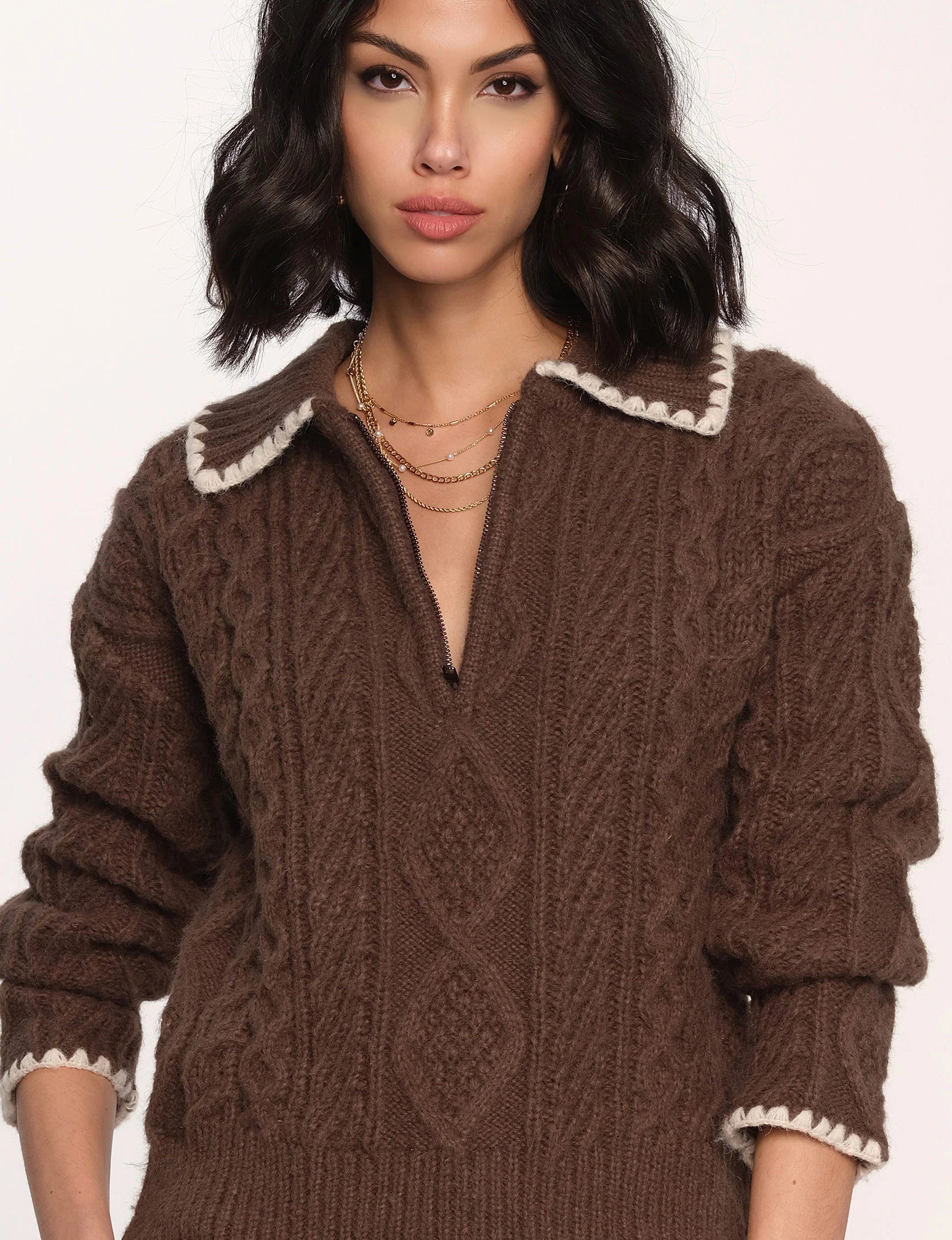 The Ivana Sweater is made from our softest melange yarn with a cable stitch detail. It features a half zip closure at front and contrast whip stitch around the collar and cuff. It gives an effortlessly polished look.