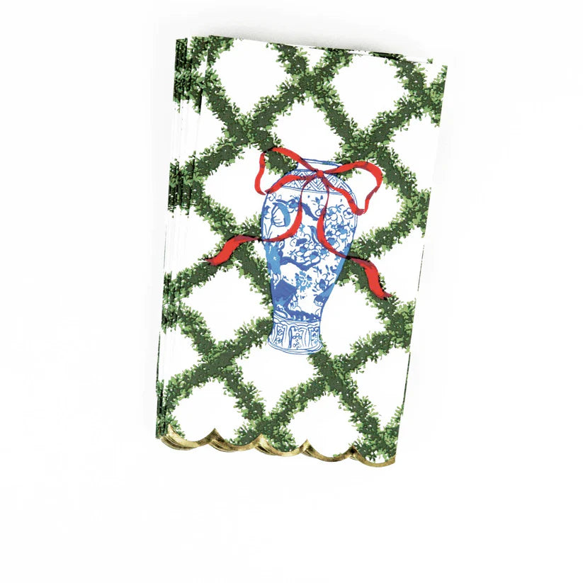 Light up any special occasion during the holdiays with these elegant Boxwood Ginger Jar Paper Guest Towel Packs. Perfect for any table, bathroom, or bar cart, these gorgeous towels will surely be the talk of the night. Crafted with gold-colored scalloped edges and ginger jar boxwood print each package includes sixteen single-use paper towels that deliver a dose of luxury to any gathering. With a stylish rattan or bamboo guest towel tray, it makes the ideal present for any special occasion. These delightful towels will delight your guests while they relax and enjoy their evening. Make sure your event is one to remember by adding these delightful Boxwood Ginger Jar Paper Guest Towel Packs – designed in the USA and imported from abroad – to all of your get-togethers! 8" x 4.25" Paper 16 per pack Disposable, for single use only