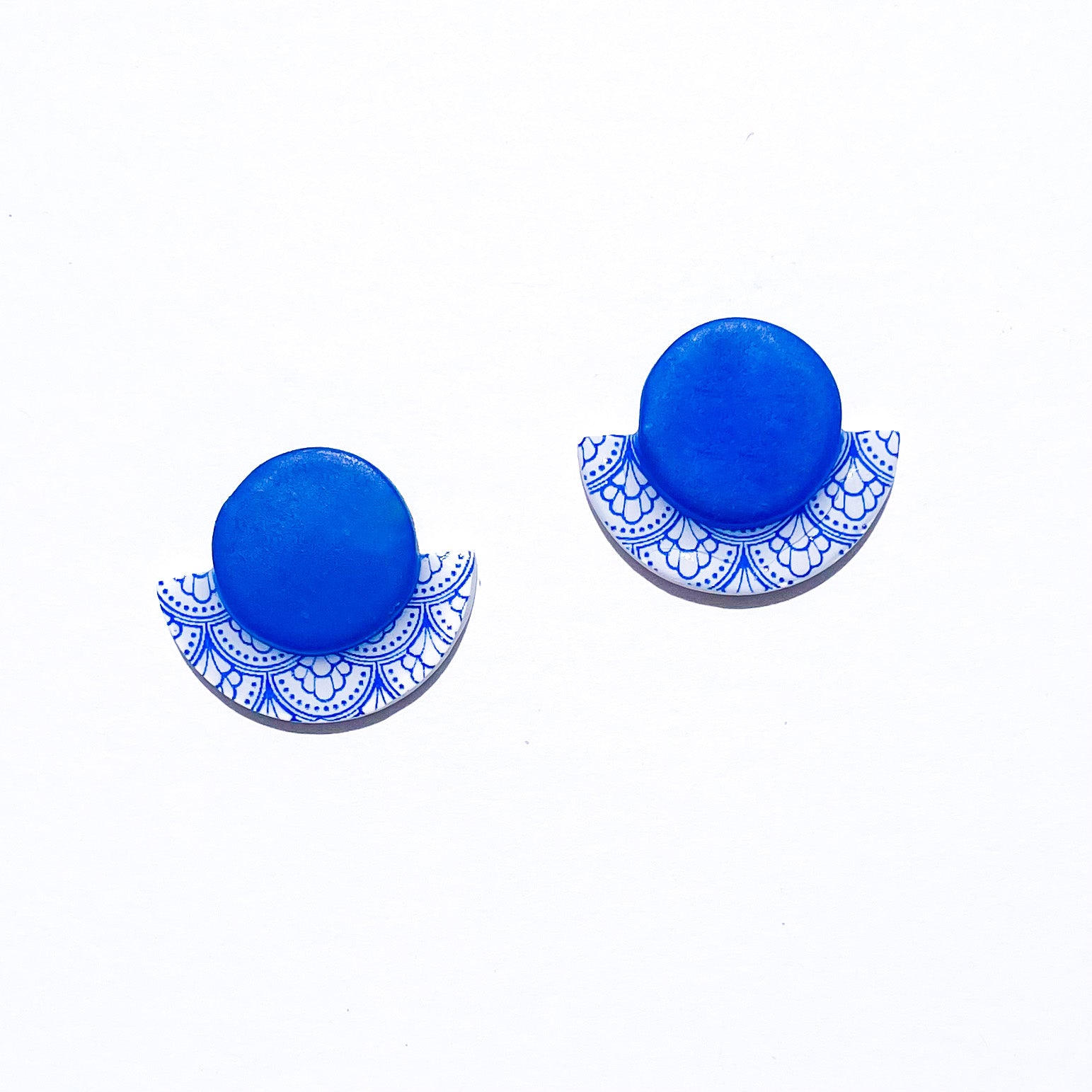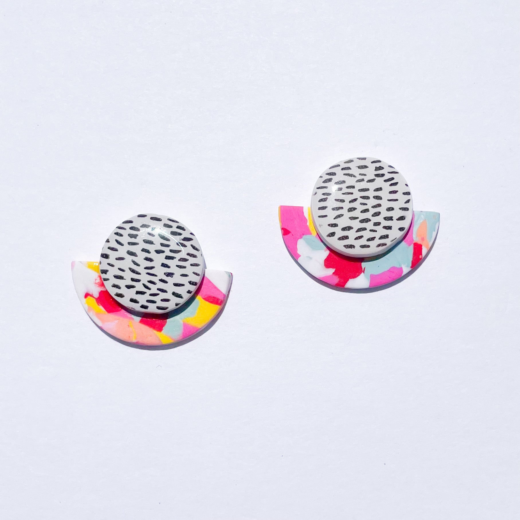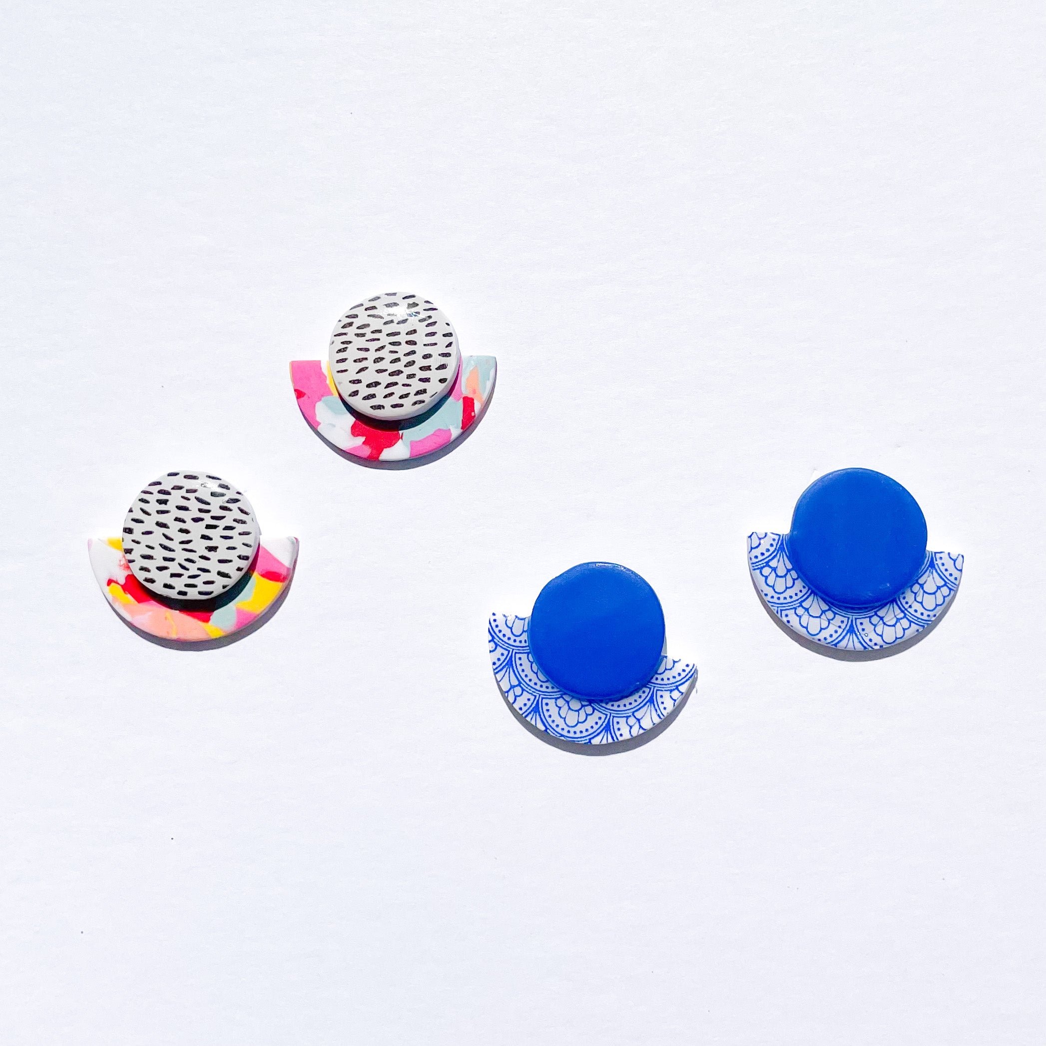 Modern Lulu polymer clay earrings are hand-cut and finished with hypoallergenic titanium ear posts with aluminum/PVC push backs. The clay components are water resistant and make for a super lightweight earring. Due to the handmade nature of these earrings, they are all unique and may vary slightly from the photos.