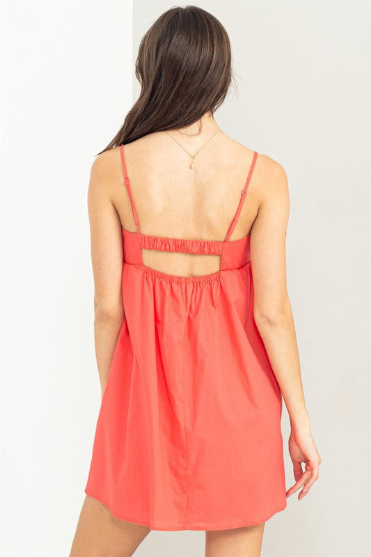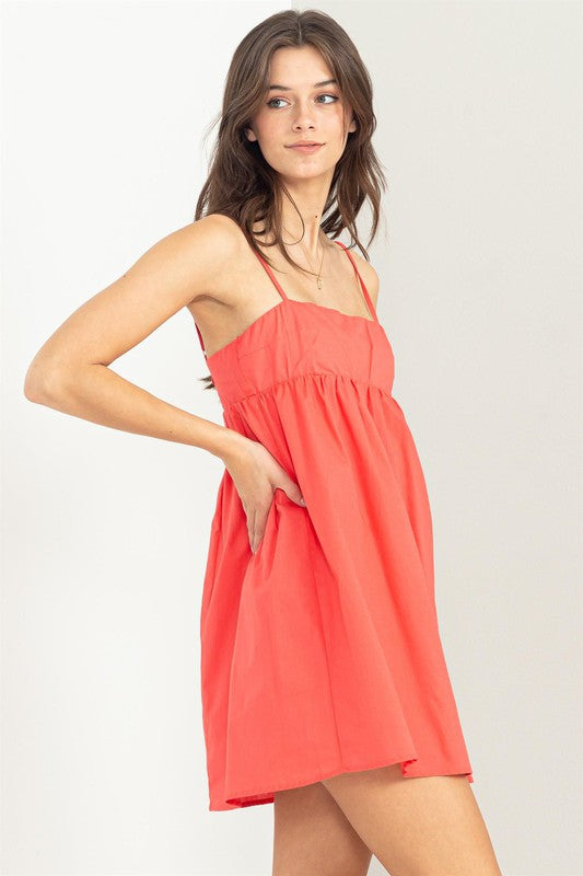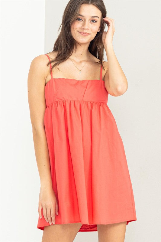 GET READY TO LOOK LIKE A DREAM COME TRUE! THIS PLAYFUL DRESS IS FRAMED WITH A STRAIGHT NECK AND ADJUSTABLE SHOULDER STRAPS, ATTACHED TO A FITTED BODICE. HIGH WAISTLINE CREATES A GATHERED LITTLE SKIRT, WHILE THE CUTOUT AT THE BACK FINISHES OFF THE LOOK. 100% COTTON MODEL IS 5' 7" TALL, 32" CHEST, 25" WAIST AND 35" HIPS AND WEARING A SIZE SMALL